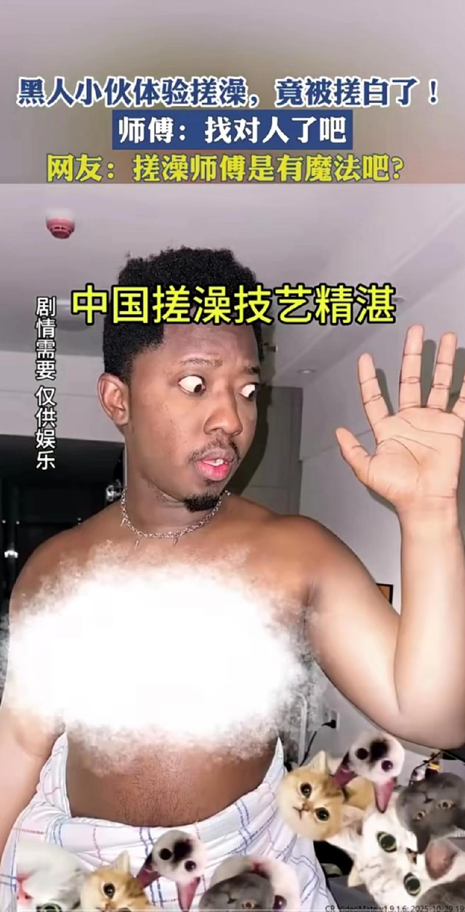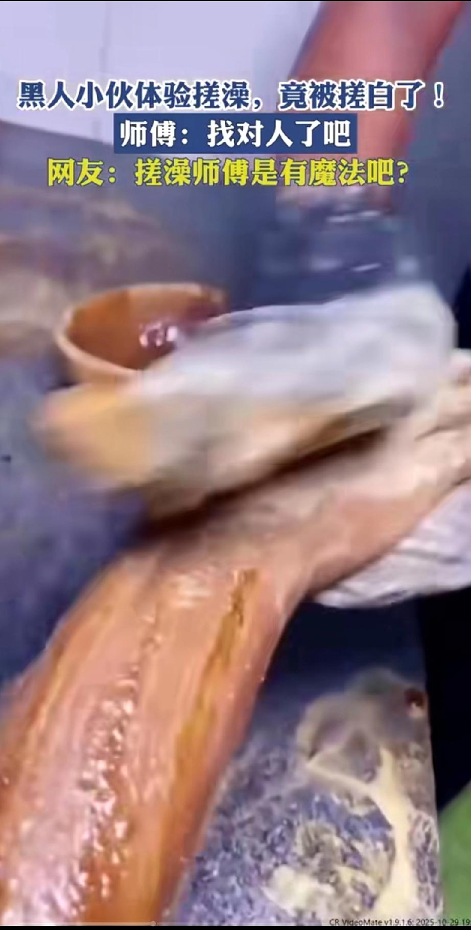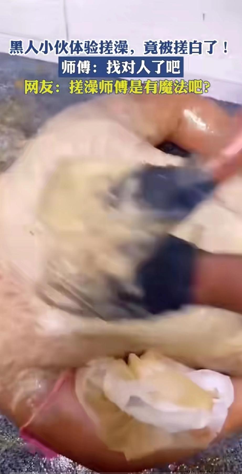 一位黑人小哥来到中国体验了一下搓澡,万万没想到自己的世界观差点崩塌,他甚至开始怀疑所谓的黑人白人黄种人之分是这个世界上最大的谎言,他们之所以皮肤黑是因为没有人教会他们如何搓澡!不信你看图黑人小哥搓完泥的地方和没有搓完泥的地方,搓过的地方是白人,没搓过的地方还是黑人!