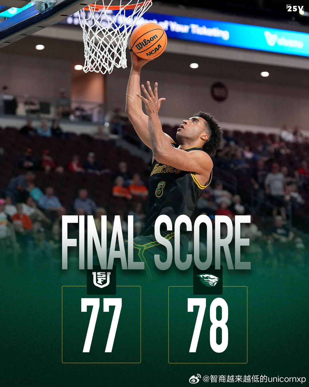 旧金山77比78不敌俄勒冈州立锦标赛遭淘汰,王俊杰出场28分钟得到4分5板,本赛季旧金山的战绩打NIT的可能性不高,赛季结束。俊杰可以开始考虑休赛期的事了王俊杰NCAA