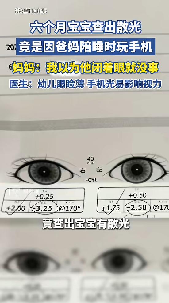 安徽,一对年轻父母带着宝宝去做体检,结果检测出有高度近视,两人还以为结果有错误,小孩子怎么会有那么高的近视,结果医生告知,这和他们每天睡前在宝宝身边玩手机有关,两人这下后悔都来不及了 起初,看到检查结果时,这对夫妻当时就懵了。两人家里都没有近视遗传史,孩子这么小,平时也注意保护,怎么会突然有高度散光?第一反应是检查结果出错了 后来一问才知道,每天晚上,这位妈妈哄睡宝宝后,就和老公躺在孩子身边玩手机。房间大灯关了,只有手机屏幕亮着 孩子闭着眼睡觉,他们觉得光照不到眼睛,肯定没事。日复一日,这成了他们一天中最放松的时刻 但他们忽略了一个关键问题,孩子虽然闭着眼,眼皮很薄,根本挡不住近距离的手机光线。那种持续的亮光刺激,会直接影响眼部发育 说实话,这个事看的让人心里不舒服,因为家长也不是故意的,他们和大多数年轻父母一样,白天忙工作,晚上带孩子,好不容易把孩子哄睡了,想刷刷手机放松一下,太正常不过了。问题就在于,很多家长根本不知道,那个习惯性动作,会在不知不觉中给孩子埋下隐患 我身边就有不少朋友,晚上带孩子睡觉时,手机基本不离手。刷短视频、看剧、逛淘宝,屏幕亮着,孩子睡在旁边,大家习以为常。没人觉得有什么问题,毕竟孩子闭着眼,怎么会被影响到? 可现实是,婴幼儿的眼睛发育非常脆弱,长时间暴露在近距离光源下,哪怕隔着薄薄的眼皮,也会对黄斑区造成刺激。更别说有些孩子睡觉不老实,翻个身,眼睛正好对着屏幕。长此以往,视力想不出问题都难 现在这对夫妻说啥都晚了,只能按医生说的,抓紧时间干预矫正,尽量减少对以后的影响。但这件事提醒所有带娃的家长,有些你以为没事的小习惯,可能正在悄悄改变孩子的一生