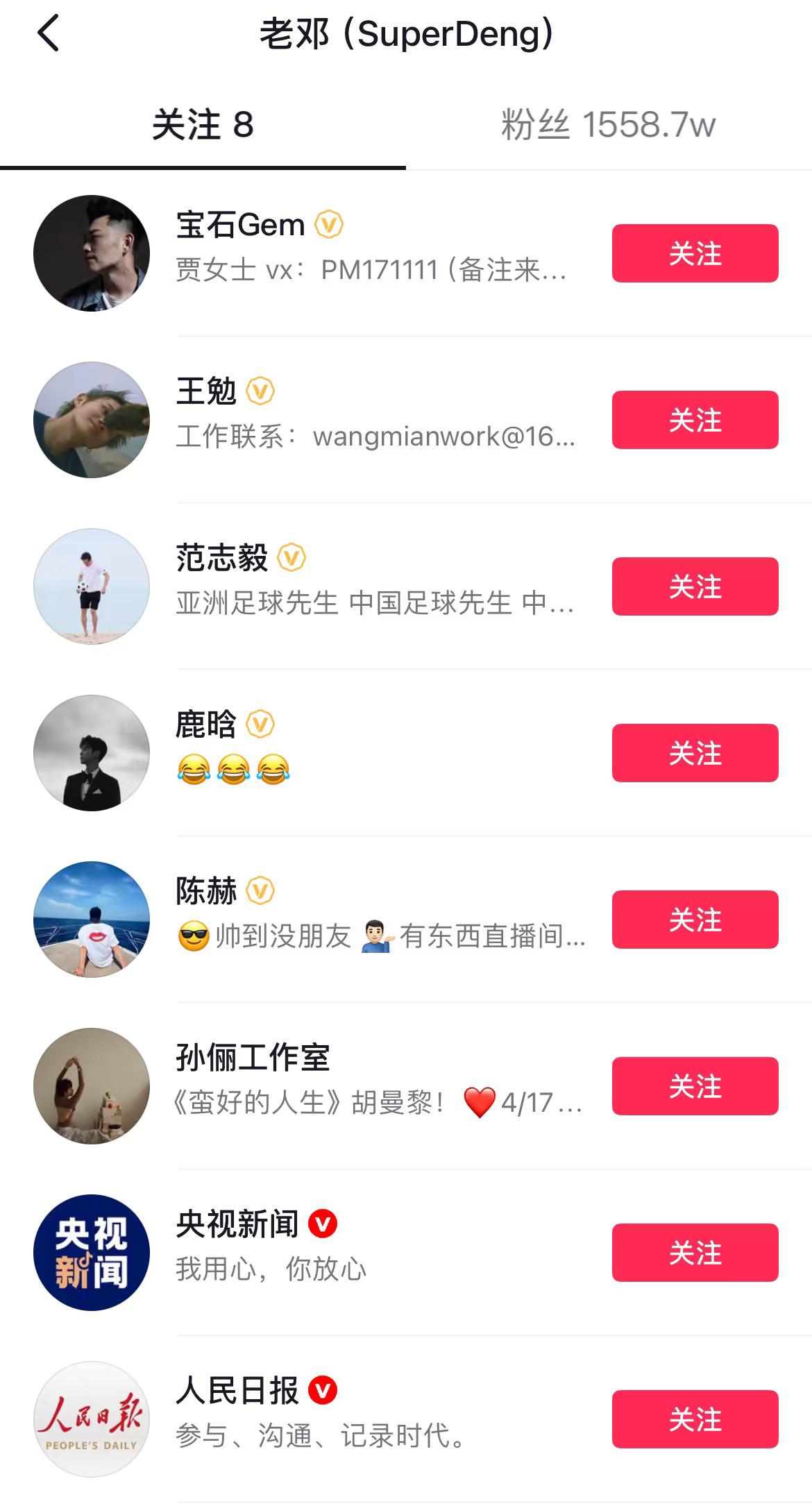 邓超第三个关注的是孙俪工作室! 自从邓超入驻抖音以来就引来全网关注。 超哥四处借粉视频也是爆火,不仅粉丝量激增,更也带火了他借粉的朋友。 非常有意思的是,他第一第二关注的是央媒,第三才是老婆孙俪,然后就是五哈,由此可总结为“先有国、再有家,然后是朋友”。