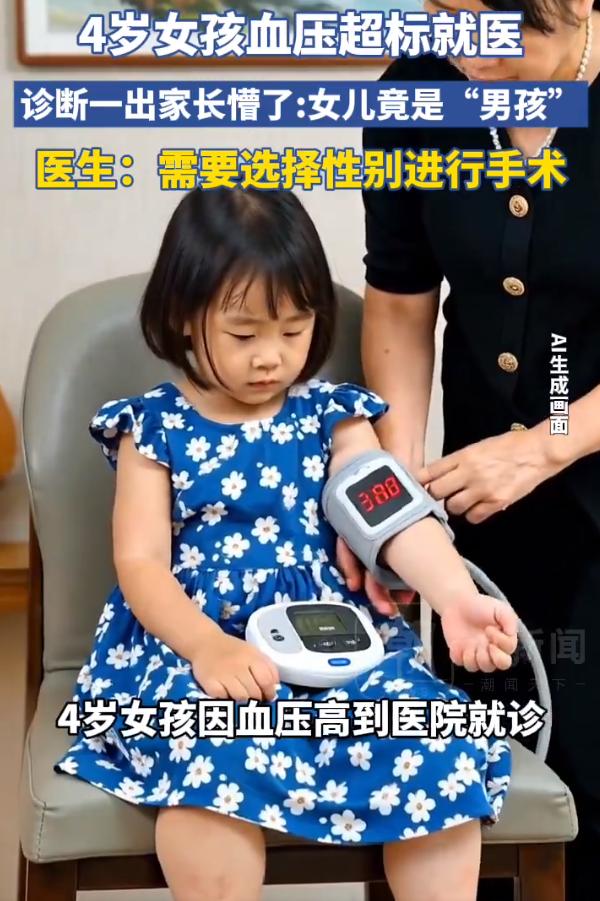 四岁女孩被诊断为男孩需选性别做手术 近日,中国科大附一院诊断出一起特别罕见的病例,一个4岁小女孩因为血压偏高去医院检查,结果直接把家长给整懵了。 孩子染色体性别显示是男性,可不管是外貌、性格还是外生殖器,完完全全都是女孩的特征。这是一种先天性的罕见病,孩子目前正在接受激素治疗,后续还必须选定性别进行手术。 表面有得选,实际没得选,她睾酮不达标,这辈子都得吃药维持男性体征,还不如选女的,不能生育罢了,还不来姨妈,挺好的。