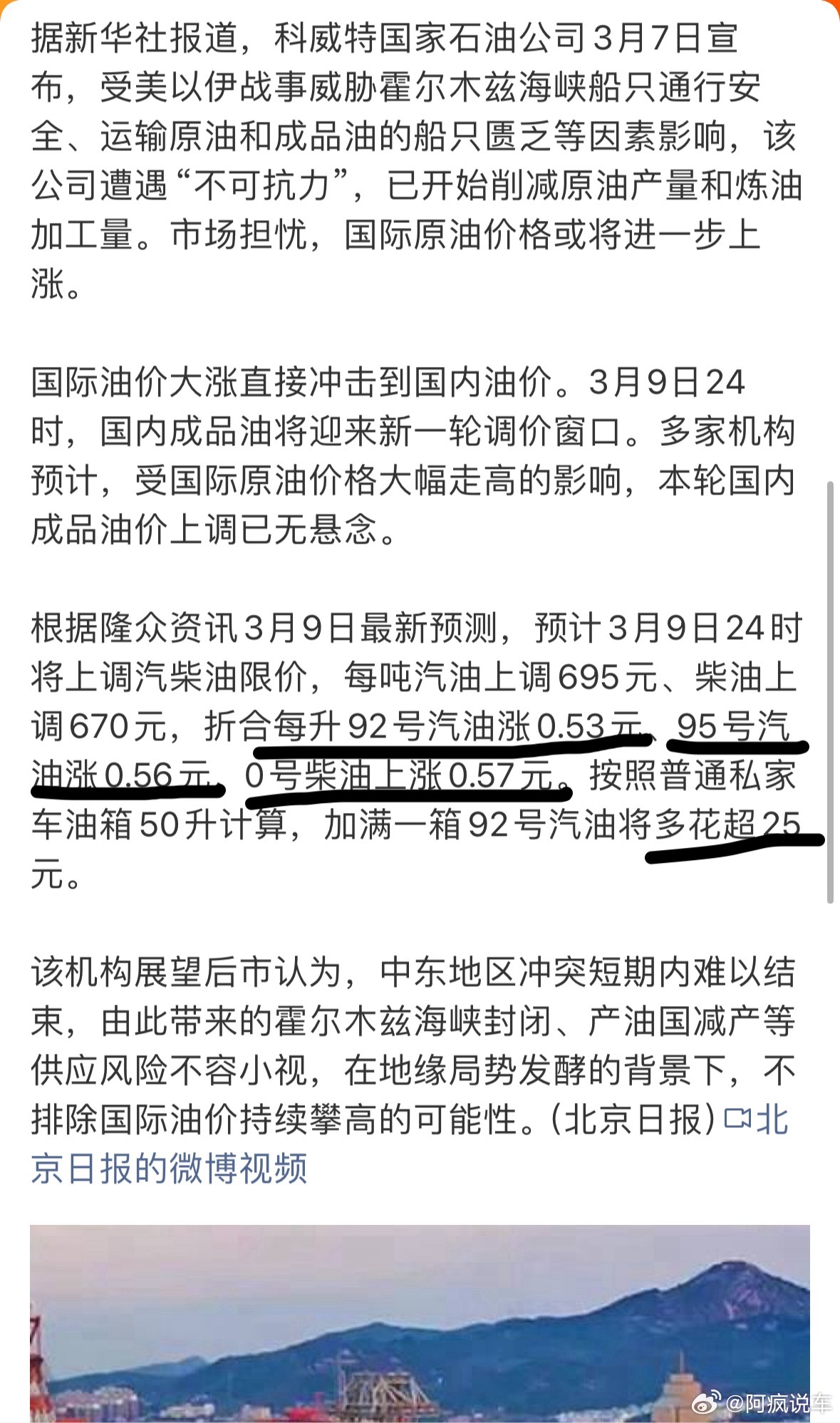 预计加满一箱92号汽油将多花超25元,国际油价暴涨,国内油价也将迎来上调。