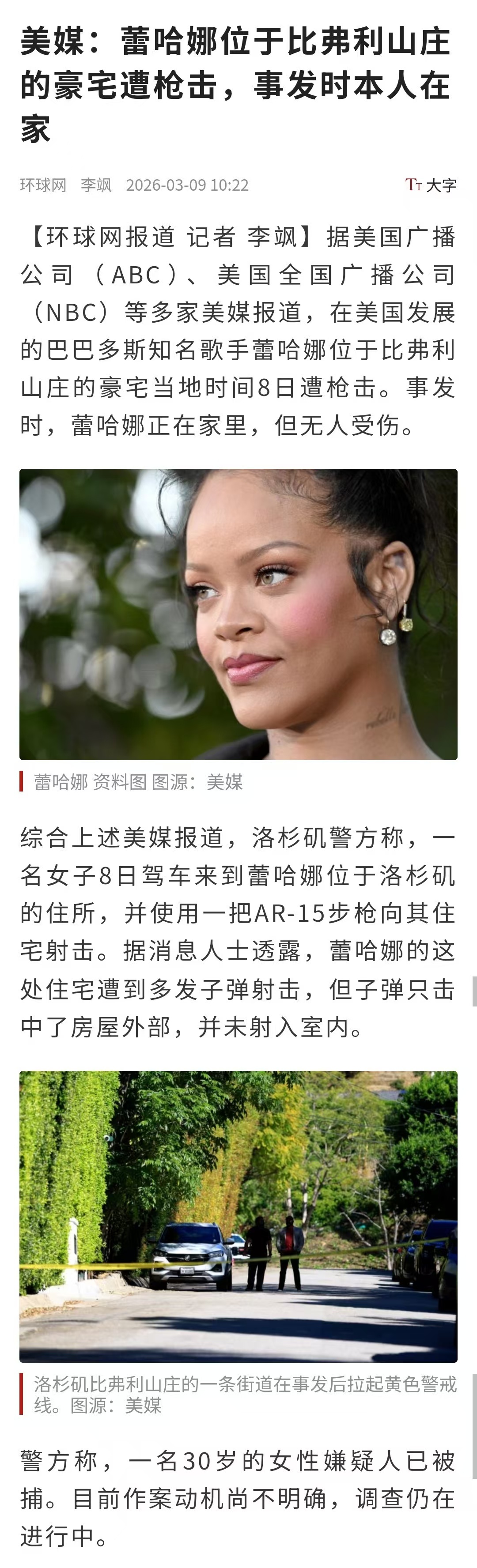 【蕾哈娜美国豪宅遭枪击】蕾哈娜豪宅遭枪击时本人正在家 据美国广播公司(ABC)、美国全国广播公司(NBC)等多家美媒报道,当地时间3月8日,歌手蕾哈娜位于比弗利山庄的豪宅遭到枪击。事发时,蕾哈娜正在家里,但无人受伤。据美媒报道,洛杉矶警方称,一名女子8日驾车来到蕾哈娜位于洛杉矶的住所,并使用一把AR-15步枪向其住宅射击。据消息人士透露,蕾哈娜的这处住宅遭到多发子弹射击,但子弹只击中了房屋外部,并未射入室内。警方称,一名30岁的女性嫌疑人已被捕。目前作案动机尚不明确,调查仍在进行中。(环球网)