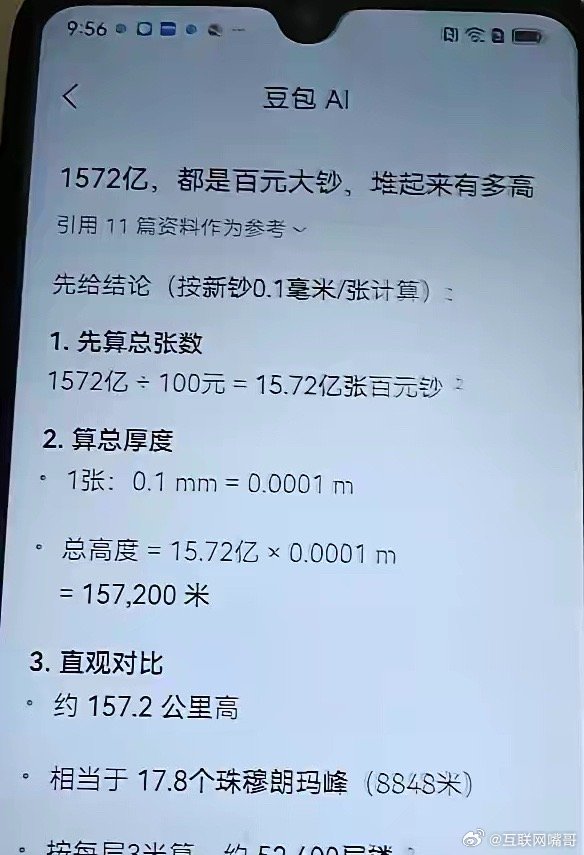 1572亿现金,如果百元大钞,堆起来相当于157200米,大约相当于17.8个珠穆朗玛峰那么高,同时也相当于52400层楼高,一家公司一年之内能发出1572亿的公司,相信整个中国境内,很难找出5家。
