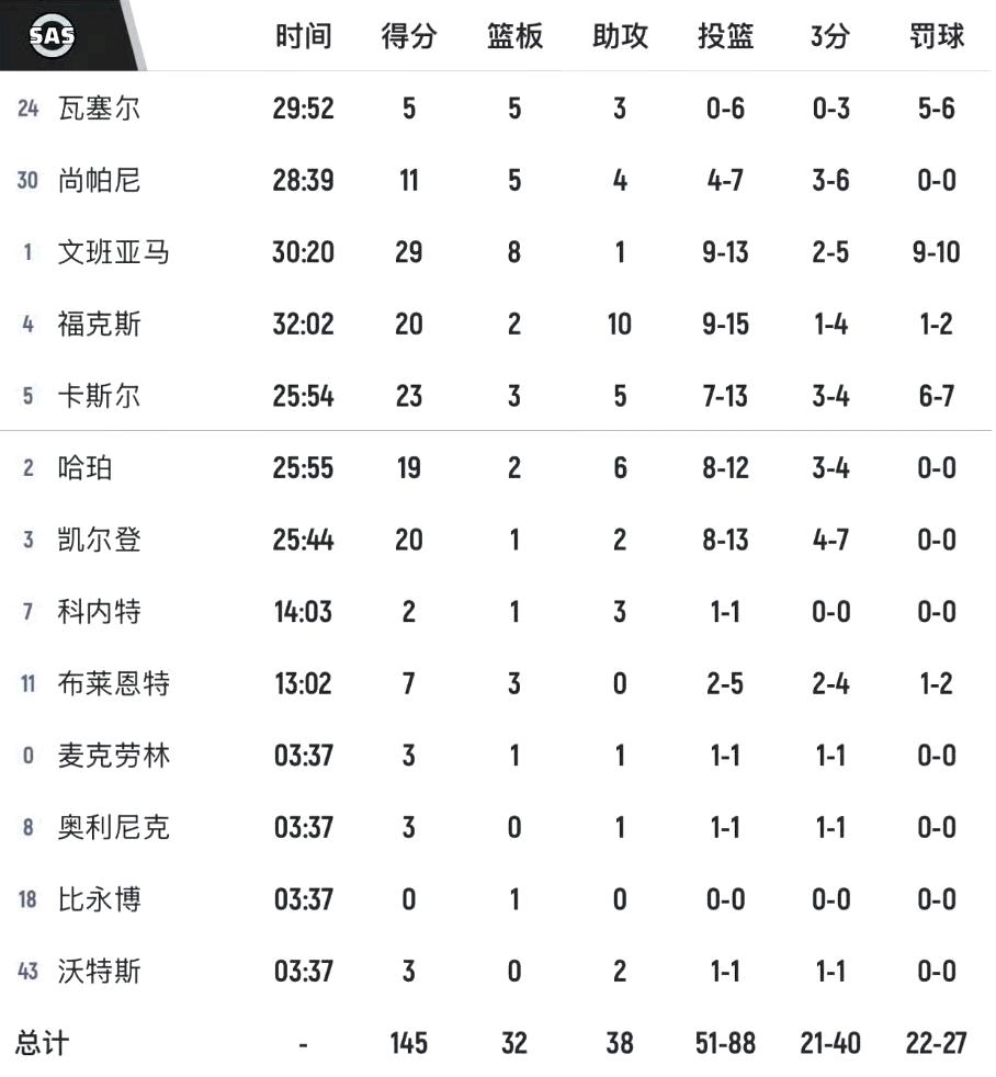 马刺145比120大胜火箭,这个队5人得分20+太恐怖了。 文班亚马29分。 福克斯20分。 卡斯尔20分。 哈珀19分。 凯尔登20分。 整个队就一名球员上场3分钟没得分,其他人个个骁勇善战,反正火箭根本打不过。 西部只有雷霆能和他们一战了。[大金牙]