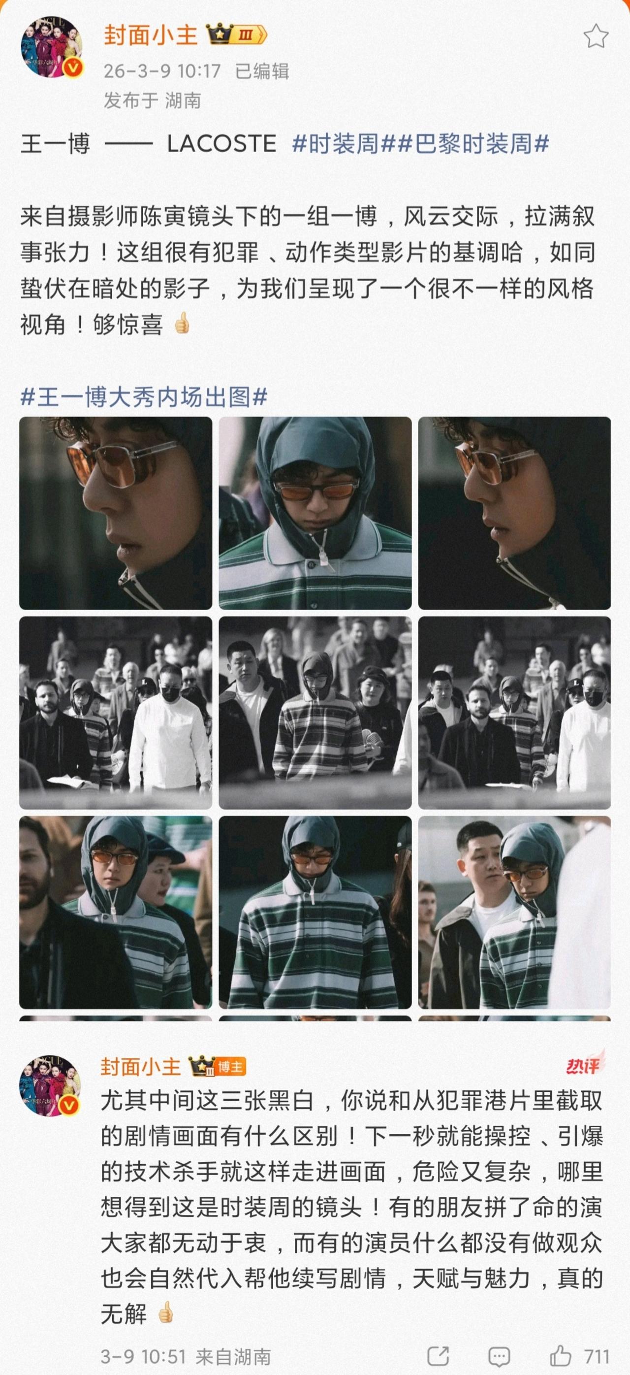 天赋与魅力,真的无解。 王一博,就是天赋与生俱来,魅力自然散发,无论是做演员做歌手还是滑板街舞攀岩赛车时尚…… 夸还是时尚博主会夸,专业摄影师镜头下的王一博,让时尚博主惊喜不已,夸起来简直如滔滔江水,连绵不绝[笑哭]。事实证明,基于真实的文案就是会更打动人。 “尤其中间这三张黑白 ,你说和从犯罪港片里截取的剧情画面有什么区别 !下一秒就能操控 、引爆的技术杀手就这样走进画面 ,危险又复杂 ,哪里想得到这是时装周的镜头 !有的朋友拼了命的演大家都无动于衷 ,而有的演员什么都没有做观众也会自然代入帮他续写剧情 ,天赋与魅力 ,真的无解 [赞]” 王一博