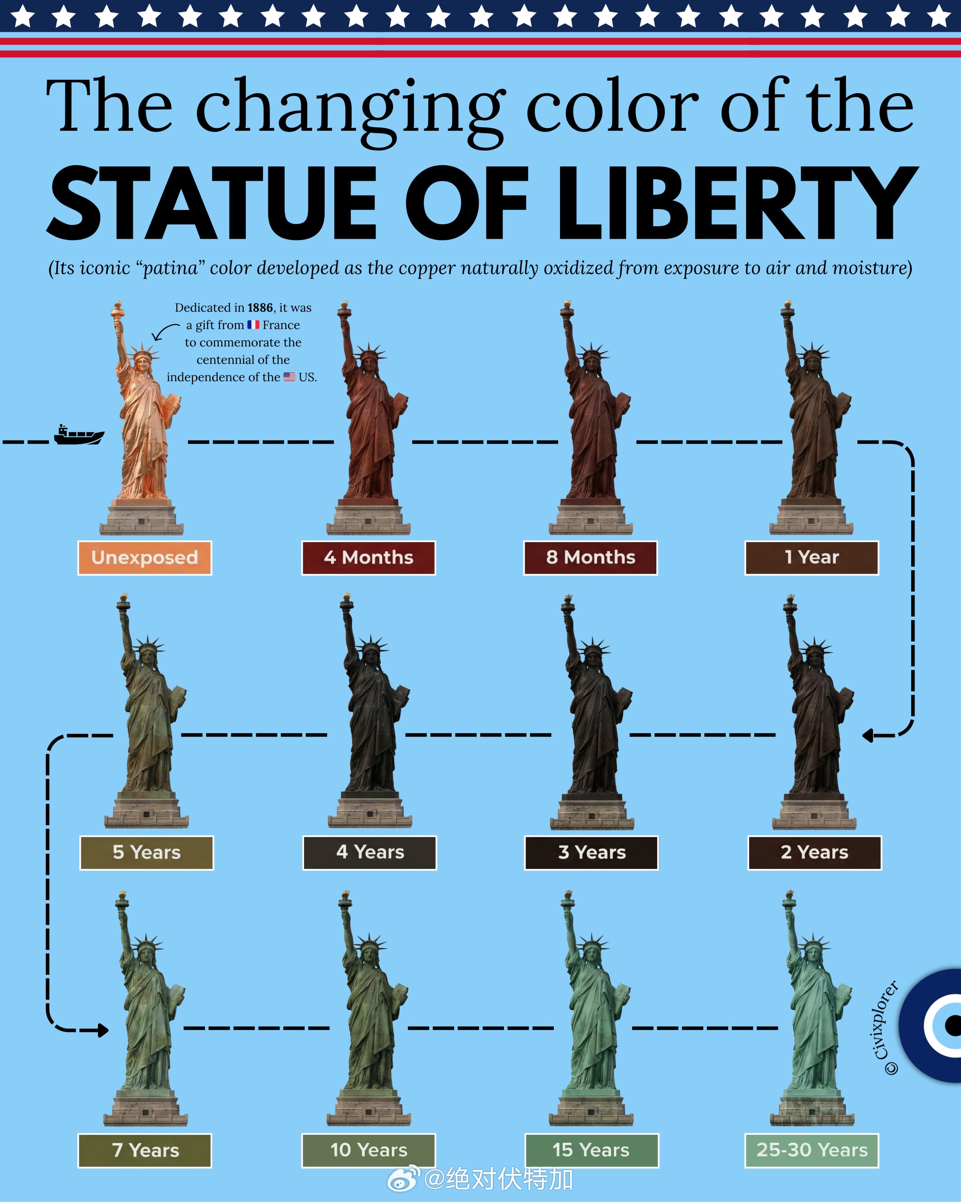 铜制自由女神像颜色随时间的变化。自由女神化学冷知识百科