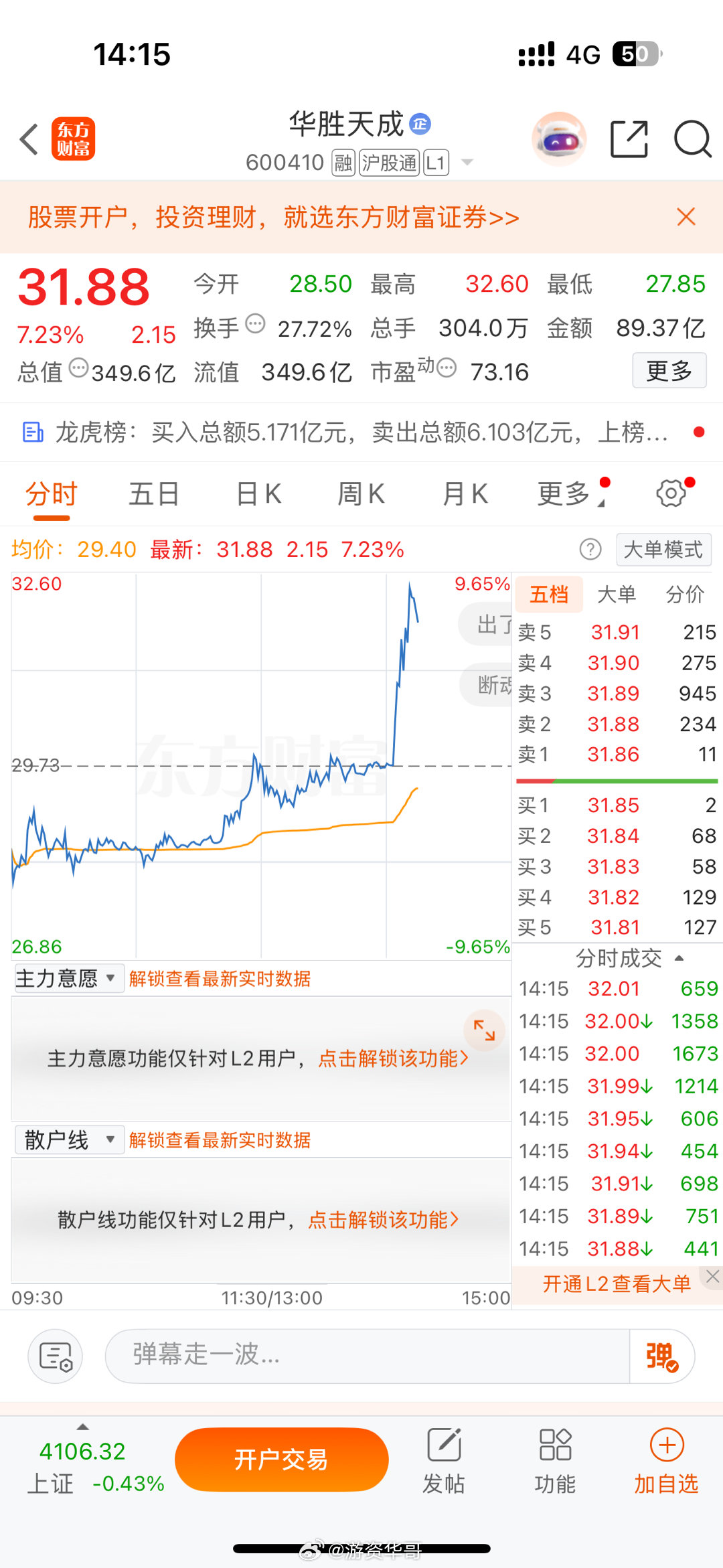 华胜天成600410强势拉升9个点,跟上的朋友都吃肉了!大家自行把握盈利,激进的