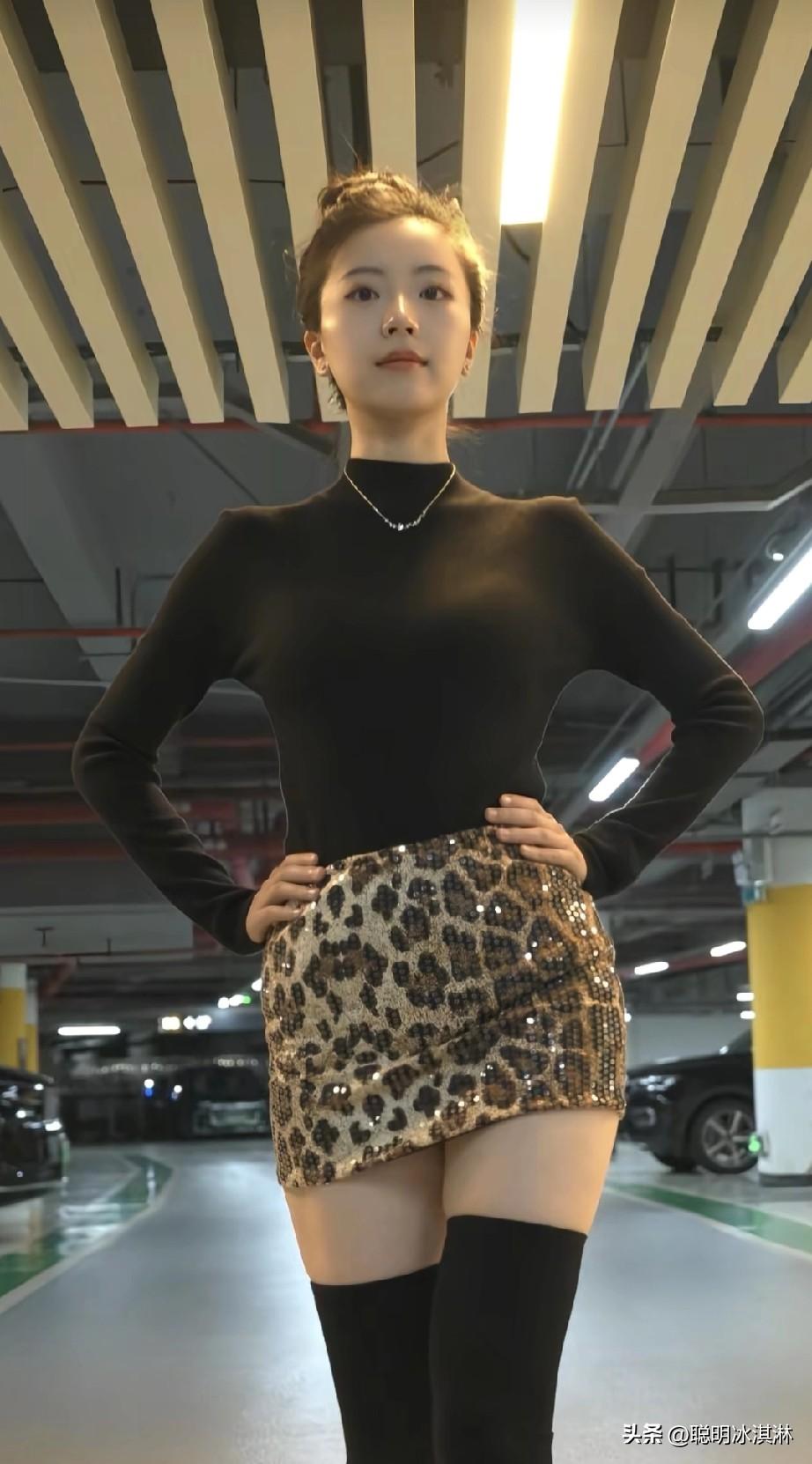 优雅黑衣,蛇纹短裙,停车场里的时尚穿搭