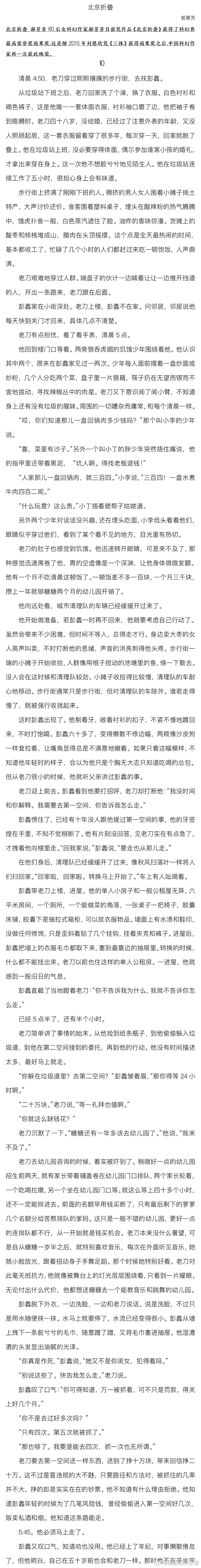 北京折叠,全文这篇文章很出名,毕竟是雨果奖获奖。国内有人说它比三体更优秀,我觉得中短篇和长篇不好比较,但是这么短,你可以现在就读完,那为什么不读一下呢?