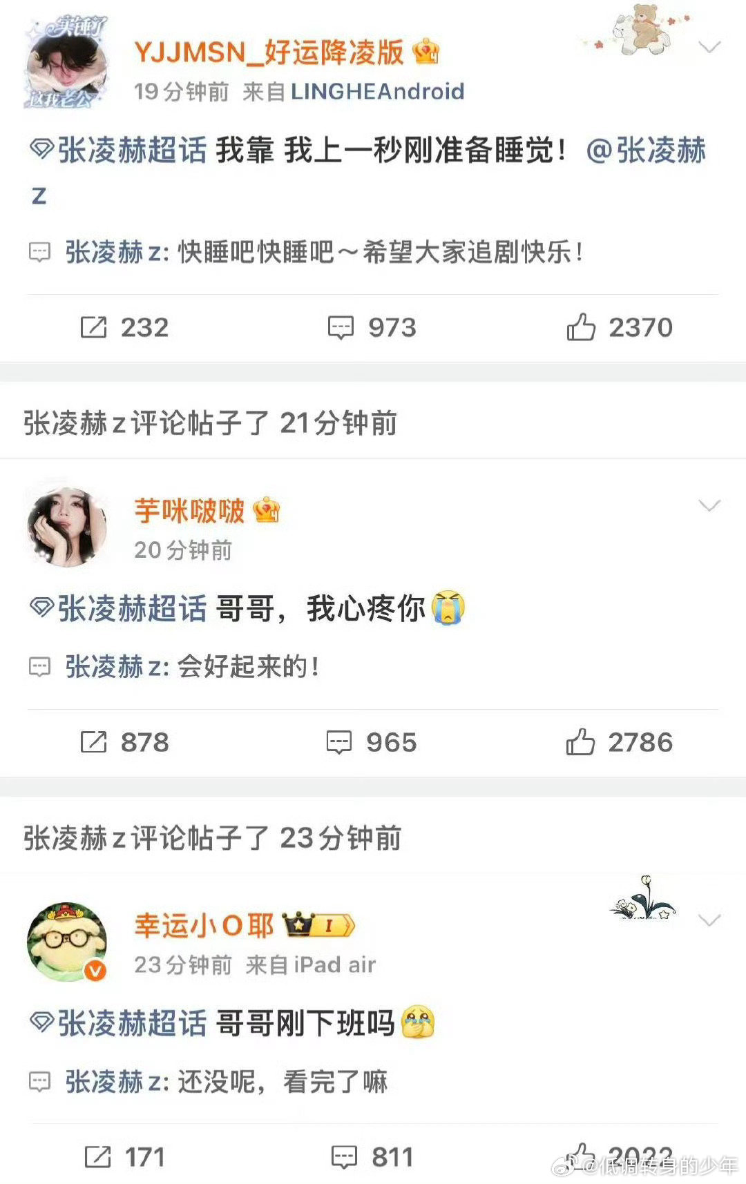 张凌赫希望大家追剧快乐逐玉是真的爆了!嘿热搜一个接一个!张凌赫特别好拍戏到半夜还来跟粉丝互动安慰粉丝会好起来的,还表示希望大家追剧快乐,粉丝也太幸福了吧张凌赫希望大家追剧快乐