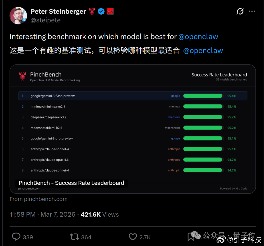 【OpenClaw最佳适配模型,OpenClaw之父推荐适配模型名单】3月9日,据量子位,OpenClaw之父发文推荐与龙虾适配的模型测试榜单,榜单名为PinchBench,专为龙虾而生,从成功率、速度、价格等维度评估全球大模型对OpenClaw的适配程度。据悉,该榜单实时更新。