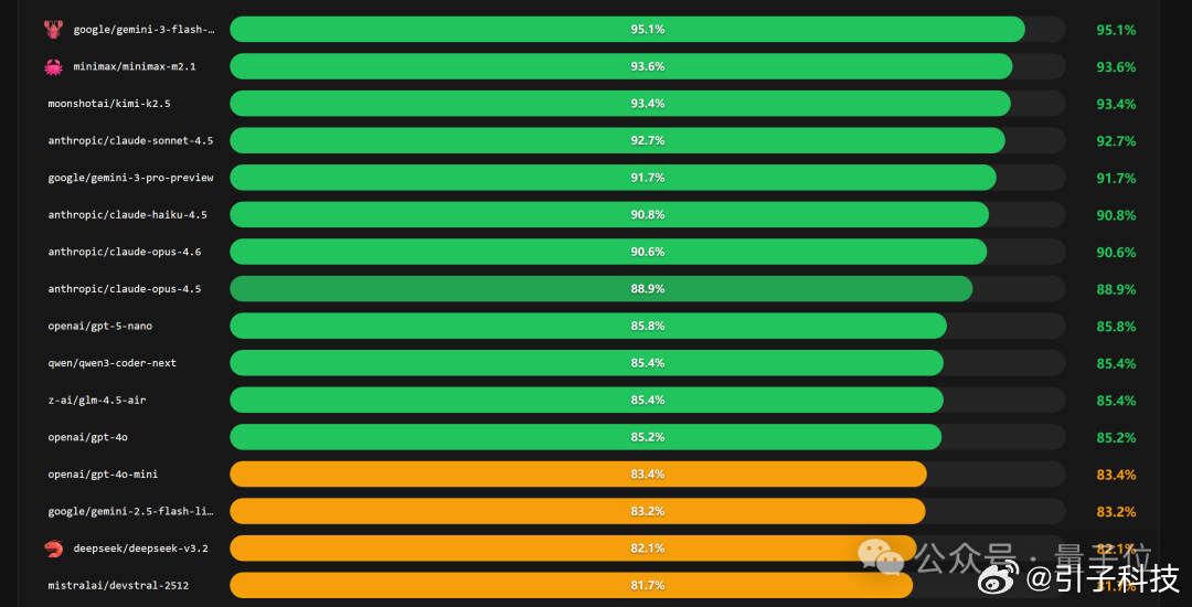 比成功率,除了第一名谷歌Gemini 3 Flash,第二、第三名都出自国内。第一名(Gemini 3 Flash):成功率95.1%第二名(MiniMax M2.1):成功率93.6%第三名(Kimi K2.5):成功率93.4%(量子位)