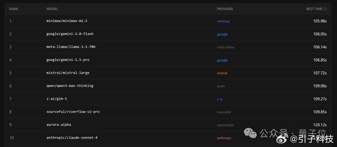 比速度,国产模型MiniMax M2.5更是一举超越Gemini、Llama等模型,登上榜首。