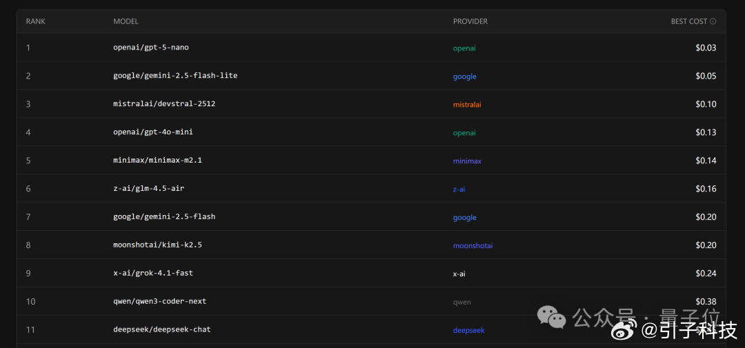排第一的GPT-5-nano(专为轻量级、高性价比场景设计),输入价格低至0.05美元/百万tokens,输出价格低至0.40美元/百万tokens。