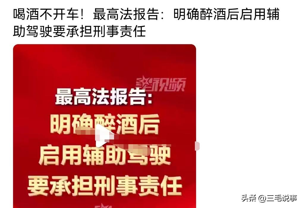 那些喜欢醉驾的不老实的车主要注意了啊。 3月9日热搜,最高法:醉酒后启用辅助驾驶要担刑责。 酒后哪怕是开启了辅助驾驶也一样被认定为是醉驾,所以不要再有侥幸心理了,因为辅助驾驶本就不靠谱。 在没有任何商量的余地,这是底线问题。 底线就是喝酒不开车,开车不喝酒。