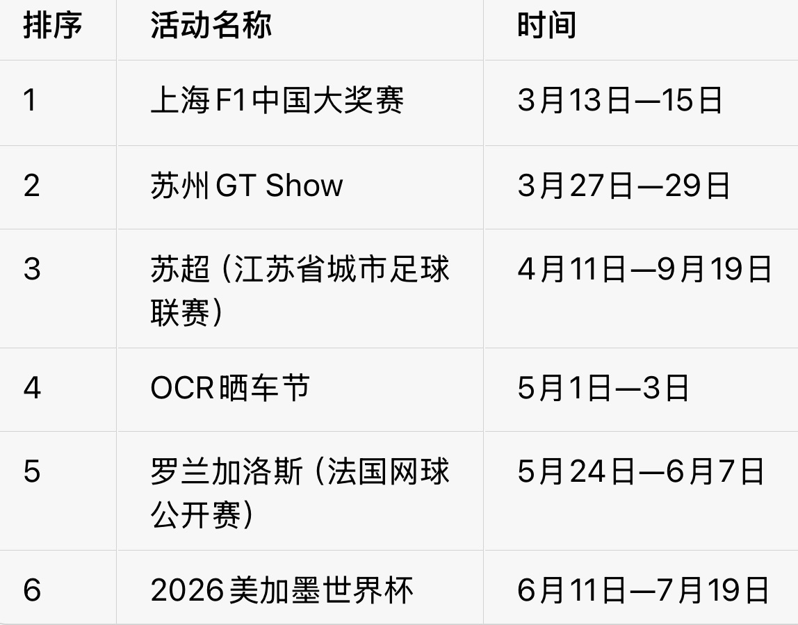 2026 上半年的我喜欢赛程已安排3月的上赛F1 到苏州GT SHOW4月的苏超常州开幕式5月的上海F1赛道OCR晒车节到法网公开赛6月的美加墨世界杯从赛道到看台,🏎️与⚽️🎾的快乐