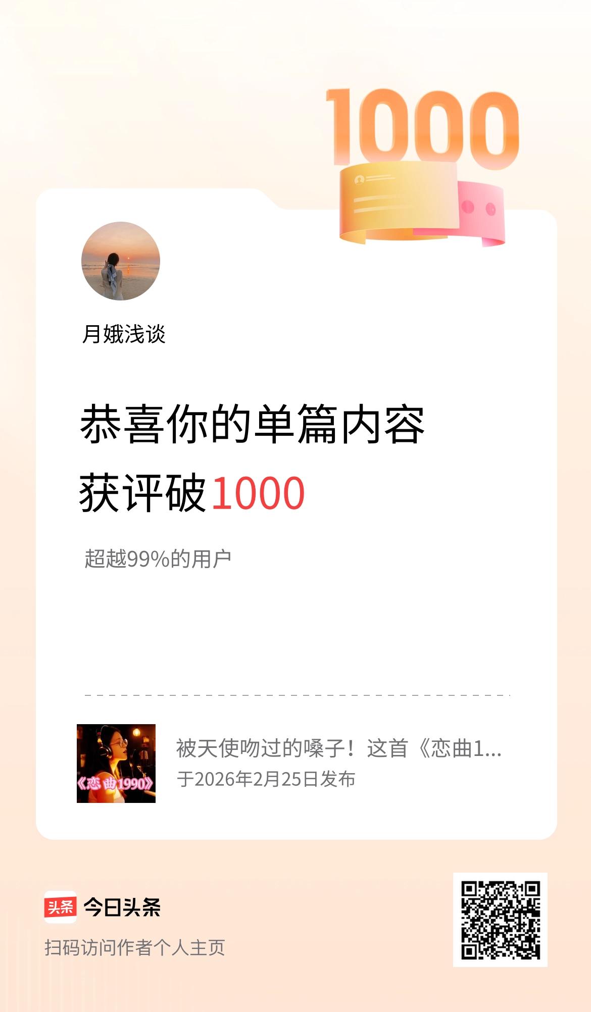 单篇内容获评论量破1000啦!真的很开心。第一次获得单篇评论破1000的荣誉。 谢谢友友们的支持和鼓励,你们的每一次评论都是我前进的动力。 我会继续努力发优质的作品,和大家一起开心快乐的度过每一天。