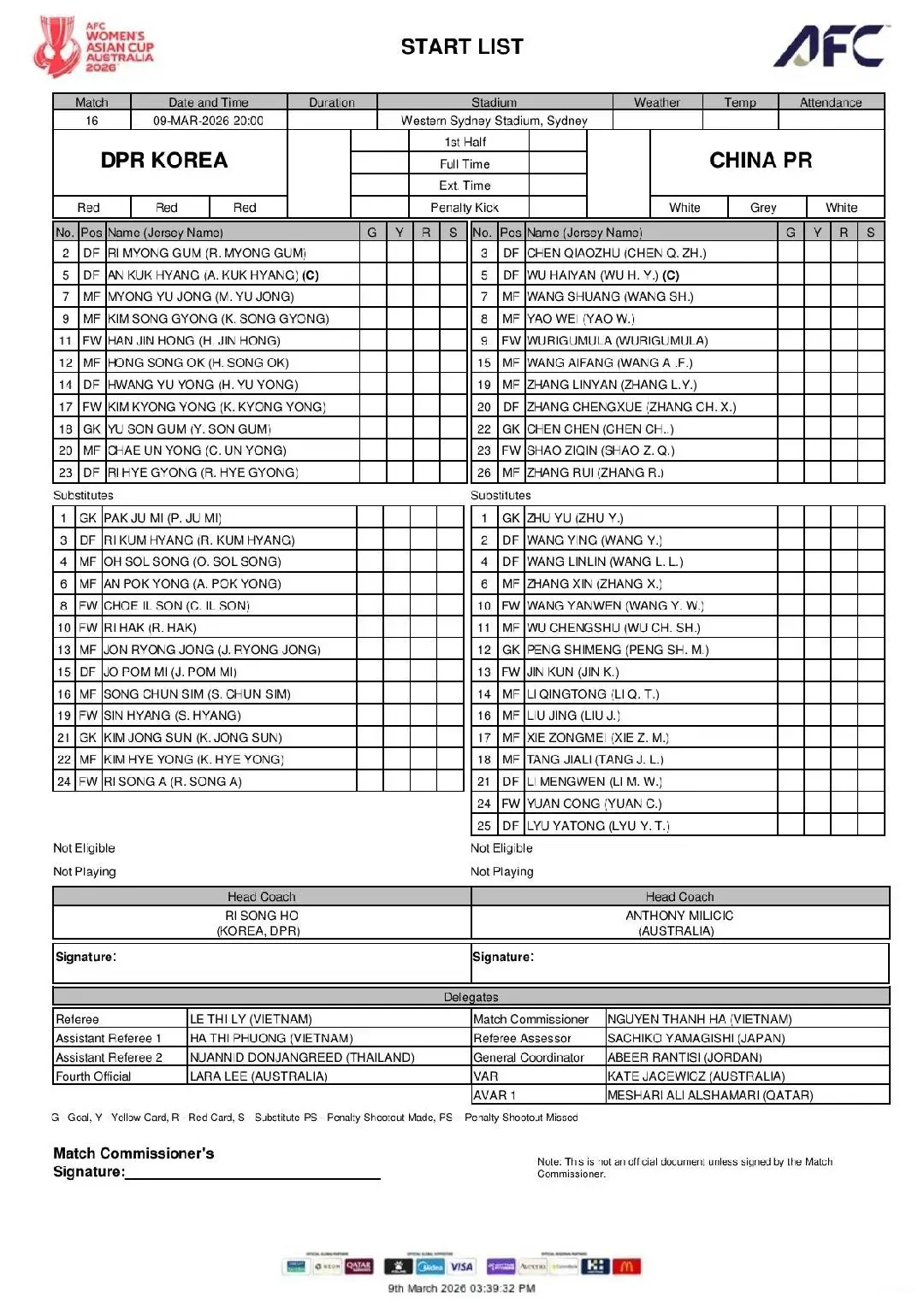 中国女足替补:1-朱钰、12-彭诗梦、2-王莹、4-汪琳琳、6-张馨、10-王妍雯、11-吴澄舒、13-金坤、14-李晴潼、16-刘靖、17-谢宗梅、18-唐佳丽、21-李梦雯、24-袁丛、25-吕亚童中国女足