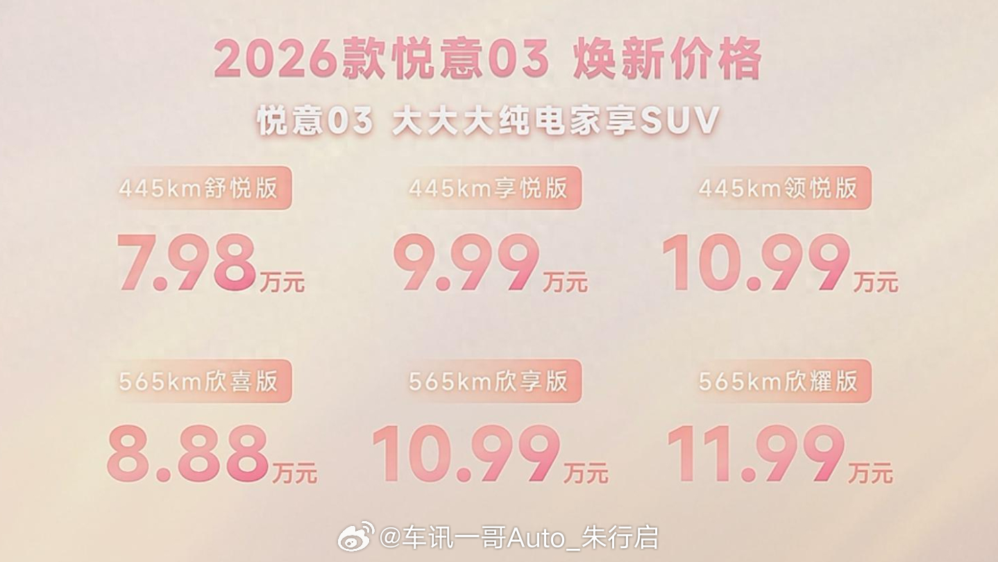 2026款悦意03正式上市,指导价7.98万-11.99万元,新车定位为纯电动紧凑型SUV,车内采用5座座椅布局,CLTC续航里程分为445公里和565公里两种。