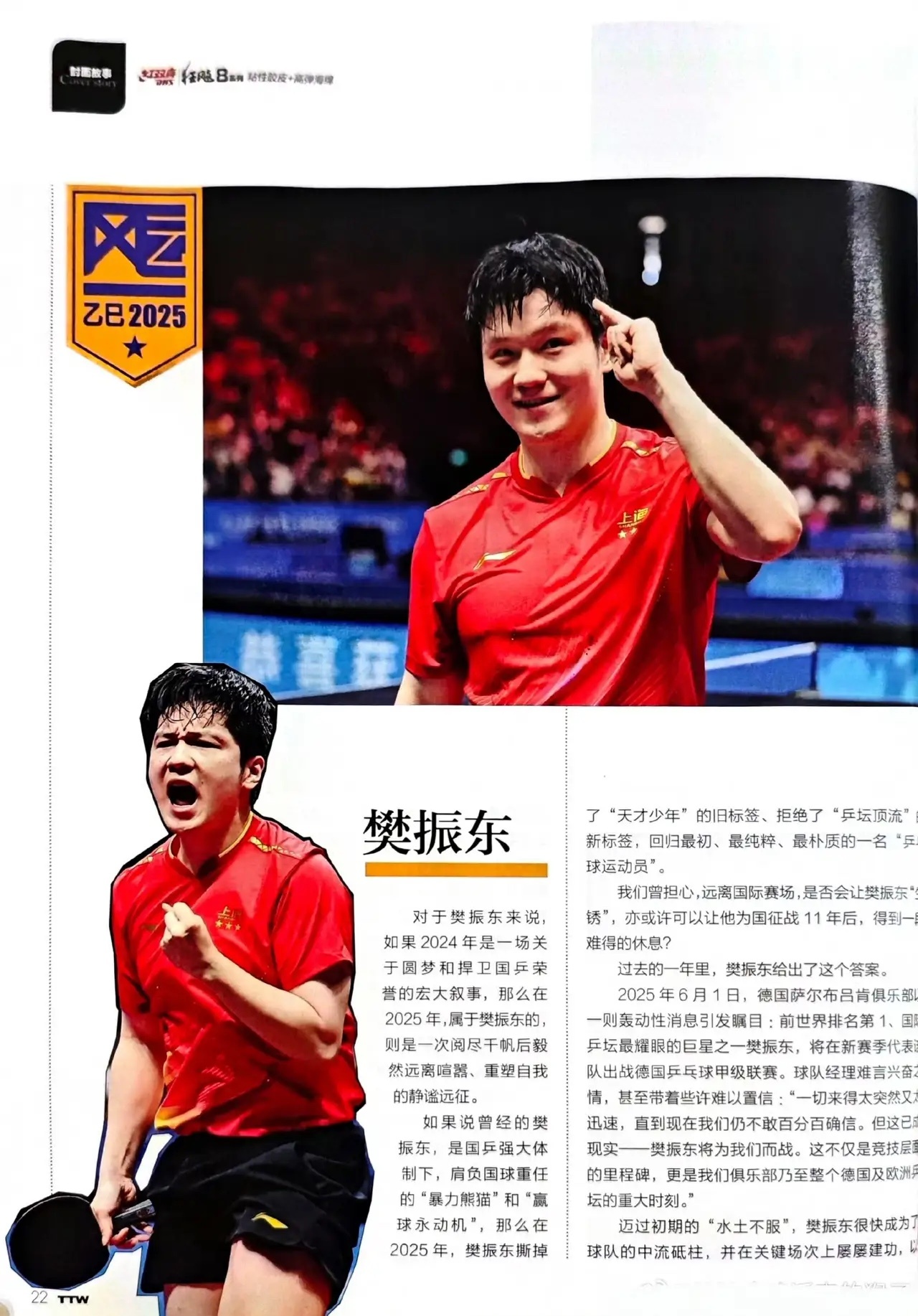 巜乒乓世界》3月刊长篇报道樊振东:在过去的2025年,樊振东没有远离国际赛场后壮志难酬的困惑,也没有在率萨尔布吕肯俱乐部登顶德甲、在全运会卫冕单打后狂欢……他就像过去无数场比赛中那样,总会在极短的时间给出最合理的“回球轨迹”……