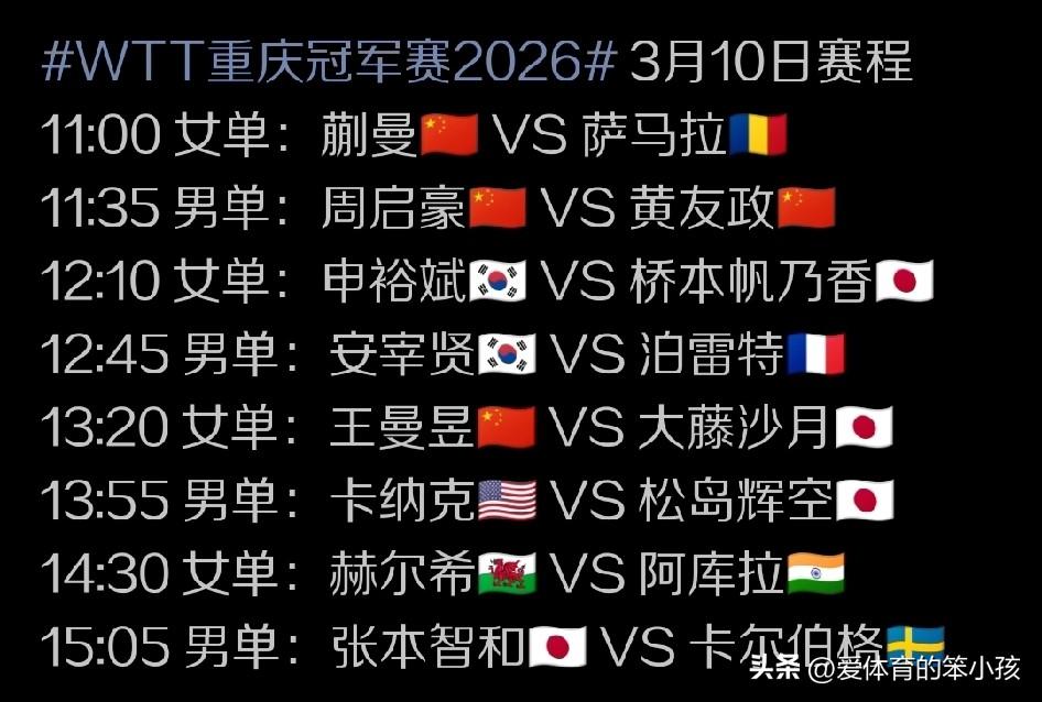 重庆冠军赛的比赛开赛在即,大家看看已经提前出炉的比赛赛程,特别是首日午间和下午时段的比赛赛程就会发现,这次比赛即使有些知名高手退赛,但是整个比赛的激烈竞争程度却并没有减弱。 比如蒯曼上午11点率先与萨马拉迎来正面交锋,即使对方在世界顶级大赛当中的成绩并不那么突出,但是这位老将在各种比赛当中的稳定性还有大赛经验还是非常充足,所以对蒯曼来说,这依然是个不小的挑战。不过要想稳住一个国乒女队核心主力名额,蒯曼还是要确保这种比赛稳稳胜出。 而在这场比赛结束之后,男单方面,周启豪和黄友政迎来队友间的较量,手心手背都是肉,周启豪近来世界赛场上的战绩复苏而黄友政也是持续提升自身竞争力和比赛成绩。不过他们在有些比赛当中都属于打好了非常突出,打不好就直接掉链子的那种风格,这次更多的就是拼一个临场发挥。双方胜负五五开。 至于申裕斌和桥本帆乃香在12:10分的女单较量,可以说同样令球迷期待。一方面申裕斌在国内有很多的球迷支持,对他印象深刻,而桥本帆乃香则经常成为国乒主力及二线高手的拦路虎和绊脚石,这次外协会当中的高手和桥本直接正面对话,球迷们也是很想看看桥本帆乃香会不会被申裕斌直接挡在次轮比赛的门外。 而韩国的男单选手安宰贤则在下午时段第一场比赛当中,迎来与泊雷特的较量。另外。王曼昱将迎战日本球员大藤沙月,卡纳克也将和松岛辉空迎来正面对决。这几场比赛也是也是午间时段的3场关键战,安宰贤和泊雷特这场比赛的比拼结果较难猜,双方也在伯仲之间。松岛辉空战胜卡纳克则将成为大概率事件。不过松岛辉空的起伏性明显,还有心态容易起变化,也将成为这场比赛他能否把自己竞争力打出来的关键。 至于赫尔西和阿库拉的比拼,我们还是更看好阿库拉。而在下午时段安排的最后一场比赛,也就是3点之后开始的一场比拼中,张本智和将和来自瑞典的名将卡尔伯格迎来正面对决。相比较而言,张本智和比卡尔伯格打这种关键比赛遭遇战的能力更强。卡尔伯格近期在世界赛场上成绩也起伏明显,不过对于卡尔伯格来说,如果超水平发挥,或者说打出自己的理想状态也有取胜的可能性,张本智和还是有6~7成的几率成为这场比赛当中的胜出者,确保拼下一个晋级名额。 大家对我们的这种预判有何观点,期待朋友们给出自己的判断。