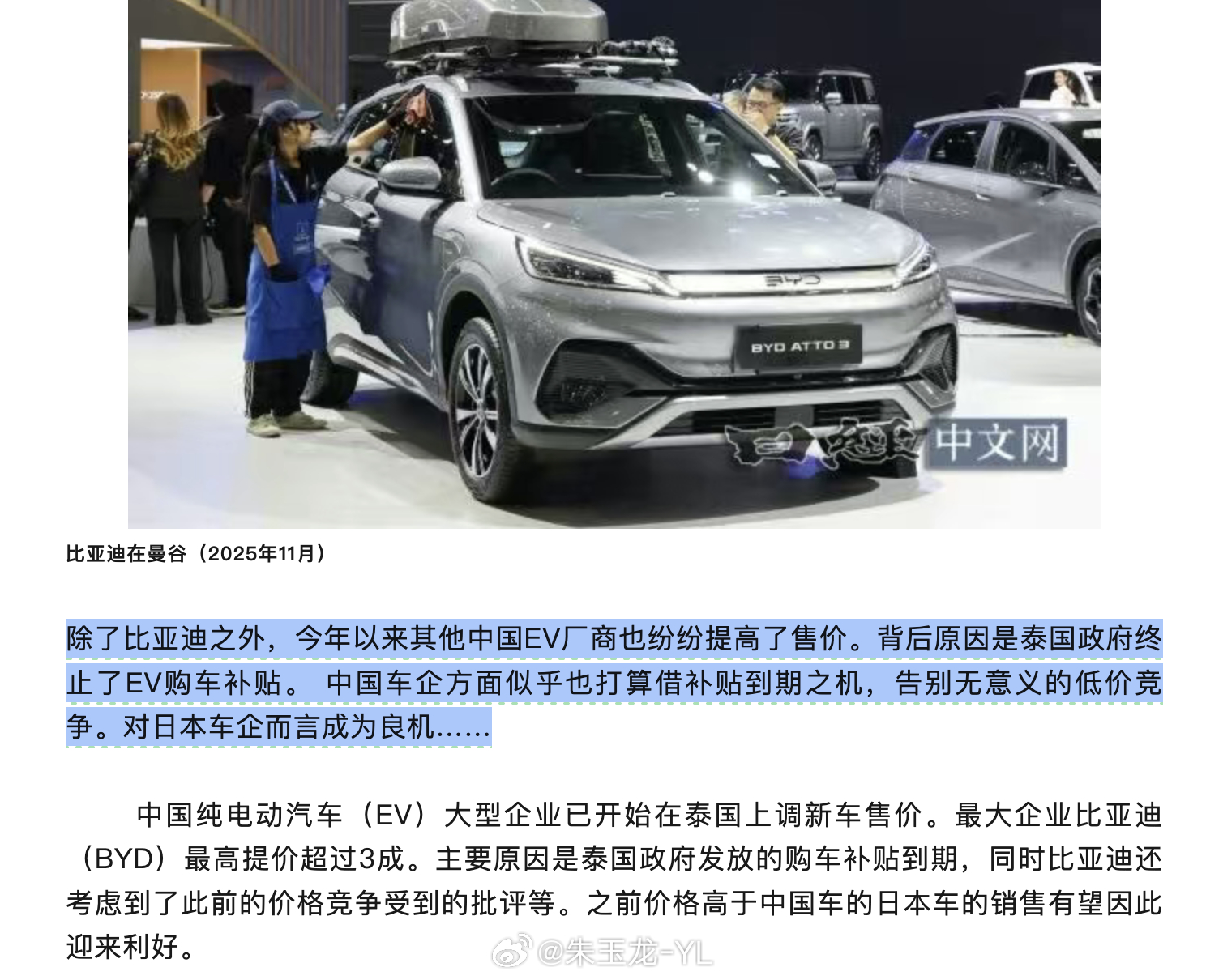 EV补贴从最高15万泰铢砍到5万,进口车消费税从2%回调至10%,还只补贴本土生产车型,明摆着就是要逼外来品牌本地化。比亚迪海豚涨33%,ATTO 3涨21%,MG、埃安也跟着涨。