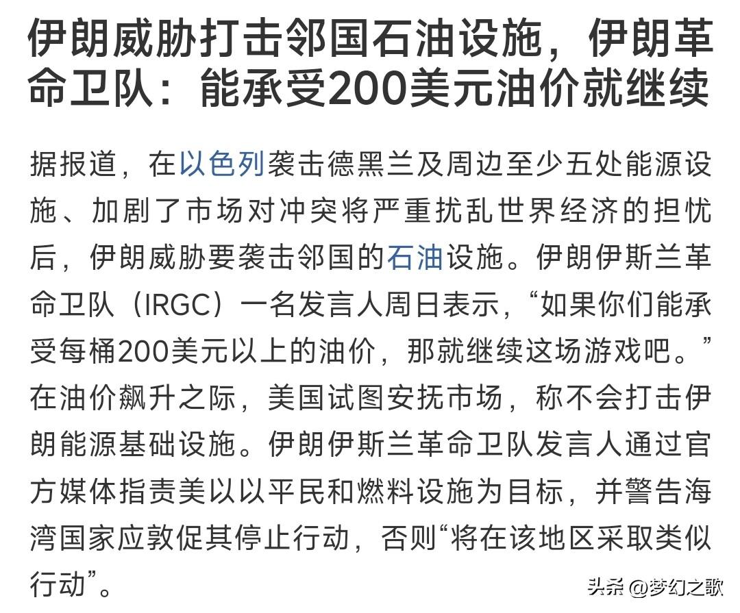 这是真打急了,已经开始威胁打不相干国家 伊朗表示如果战争继续将会打击邻国的石油设施。也就是说,伊朗想用油价来遏制美以的对伊朗的打击。 实际上现在油价已经突破了105美元,美国的CPI已经增加到了3%以上,而欧洲的通胀预期会达到2.25%以上,这种通胀会随着油价的上涨继续上升。 不难看出,伊朗现在是真的急了,连不相干的邻国都要开始进行打击,相当于卷入更多的国家进行战争当中,将会对世界经济进行严重的破坏。
