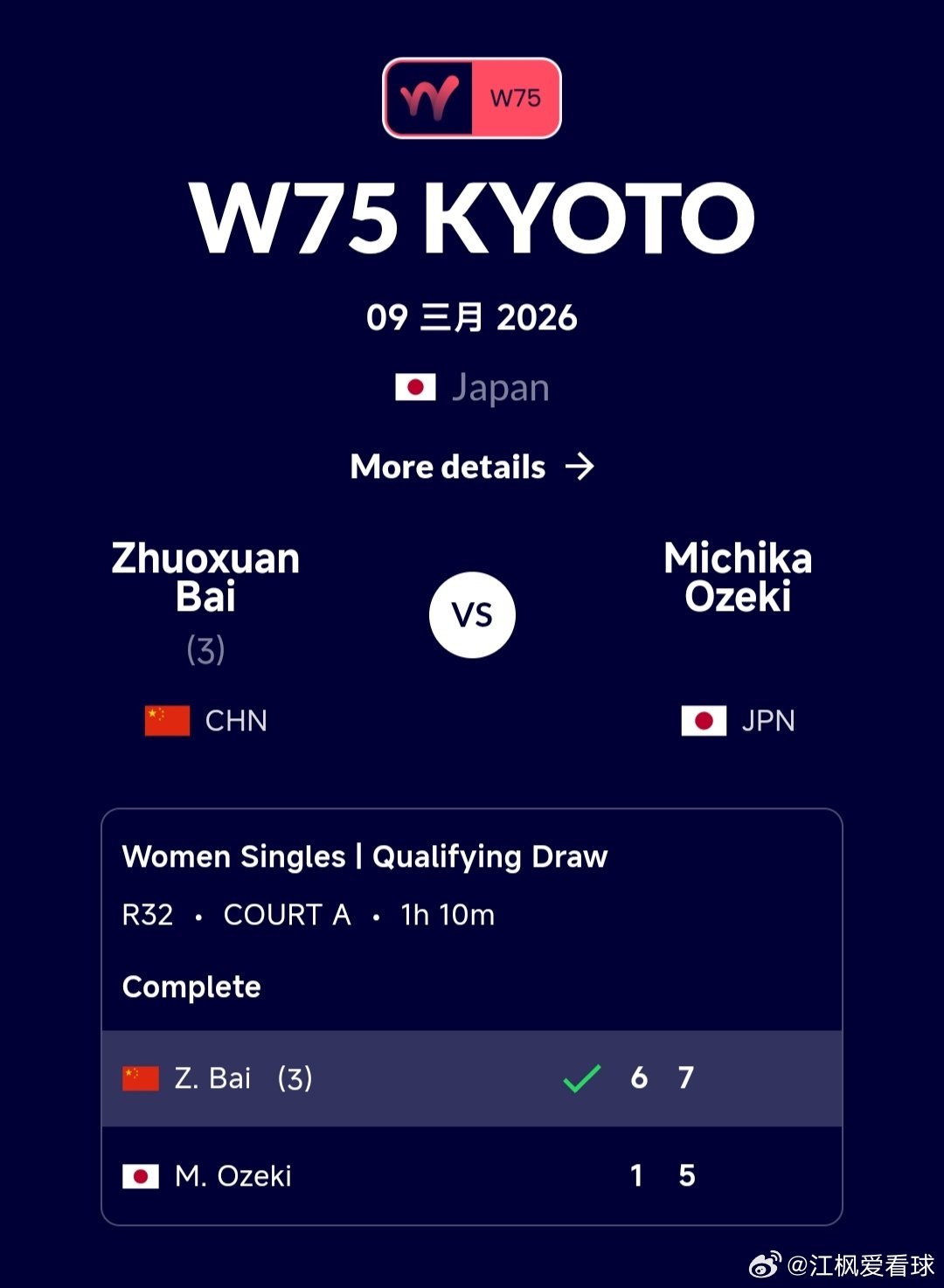 白卓璇🇨🇳6-1/7-5战胜小关美知甲🇯🇵,晋级决胜轮,恭喜白卓璇!🎉🎉🎉