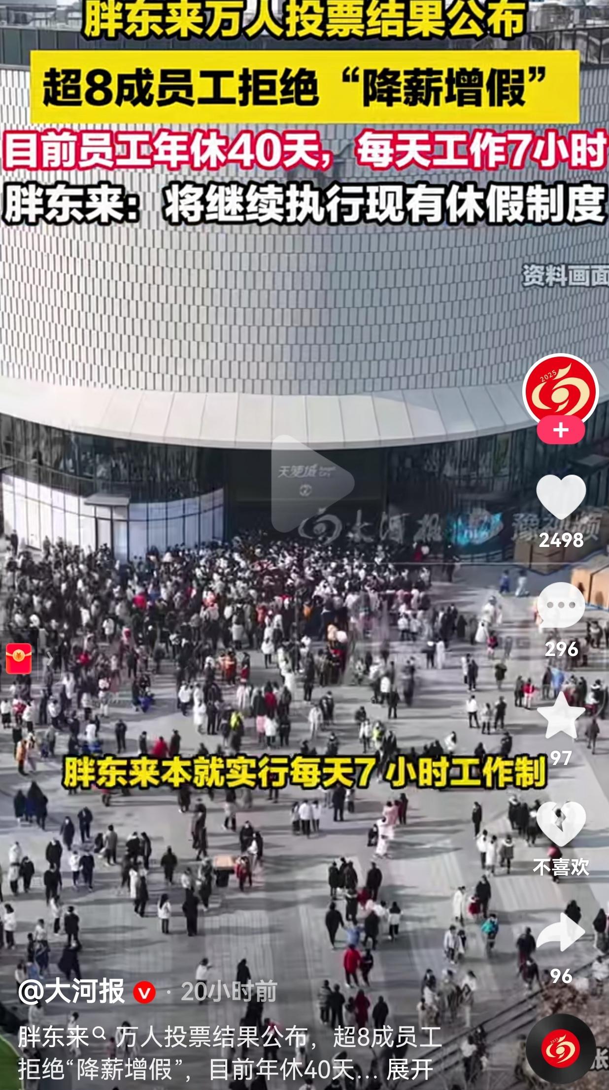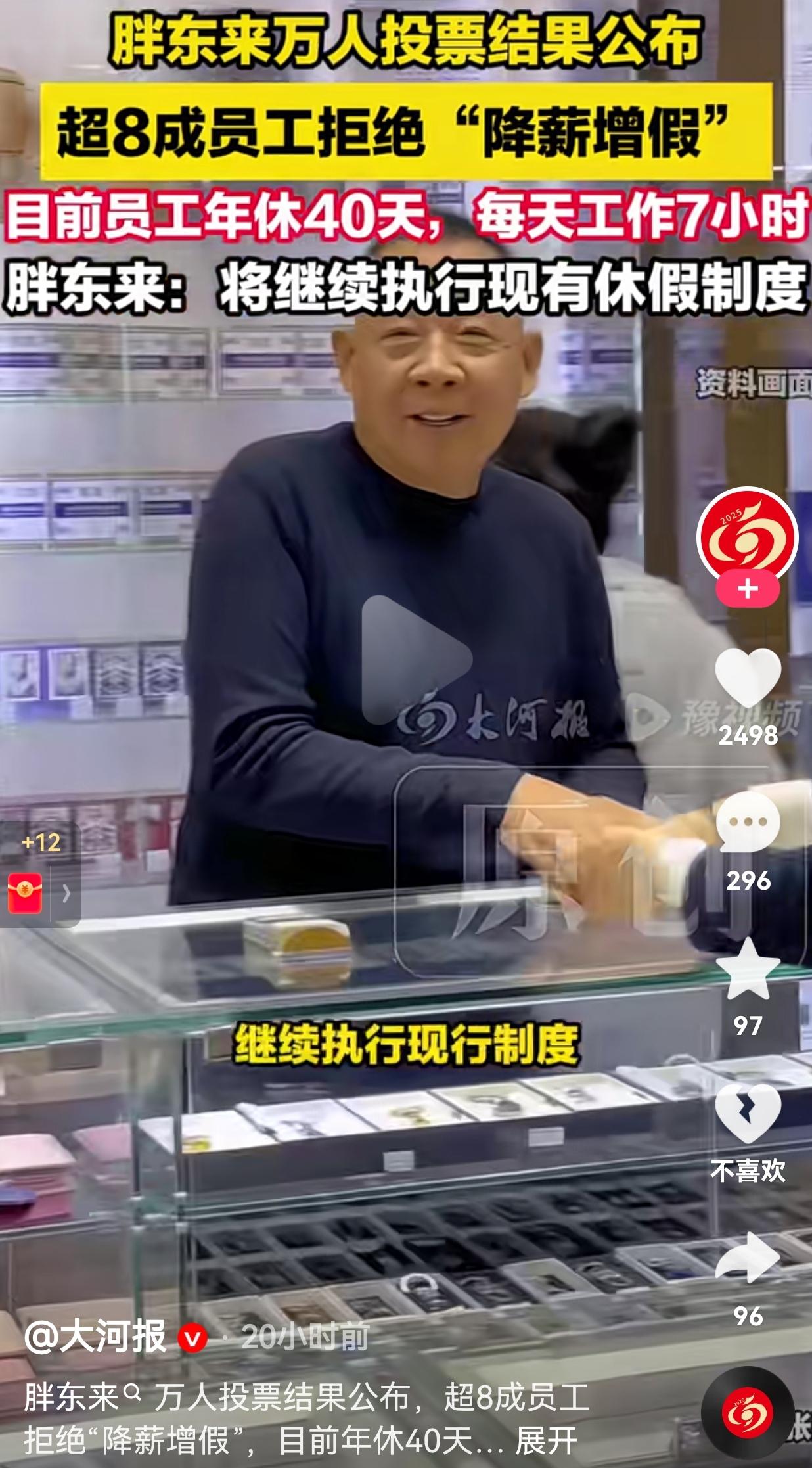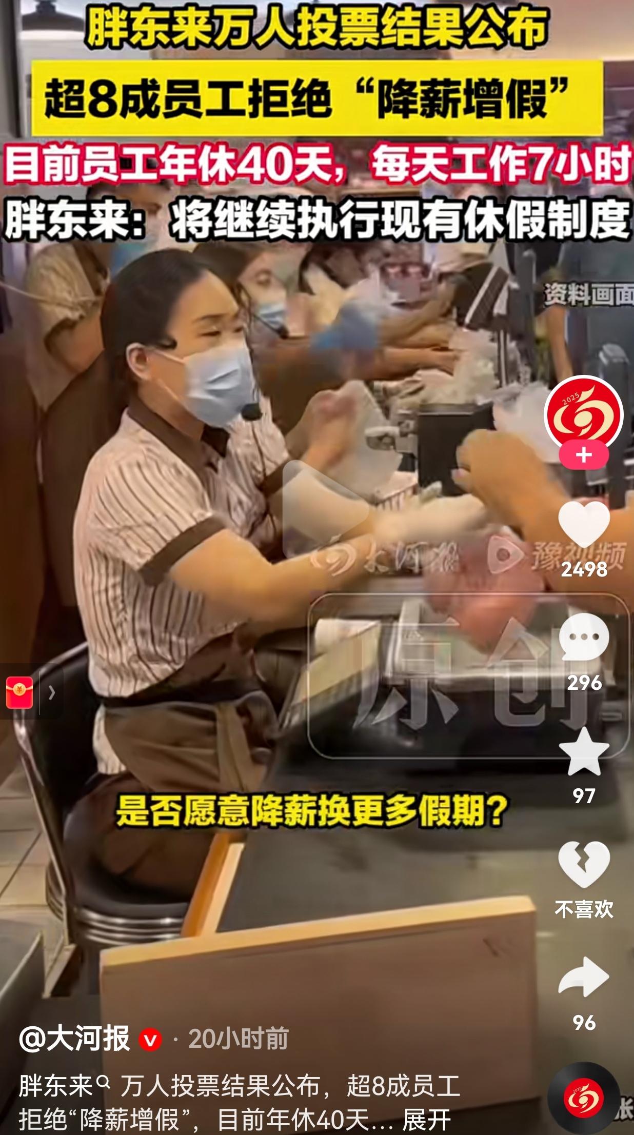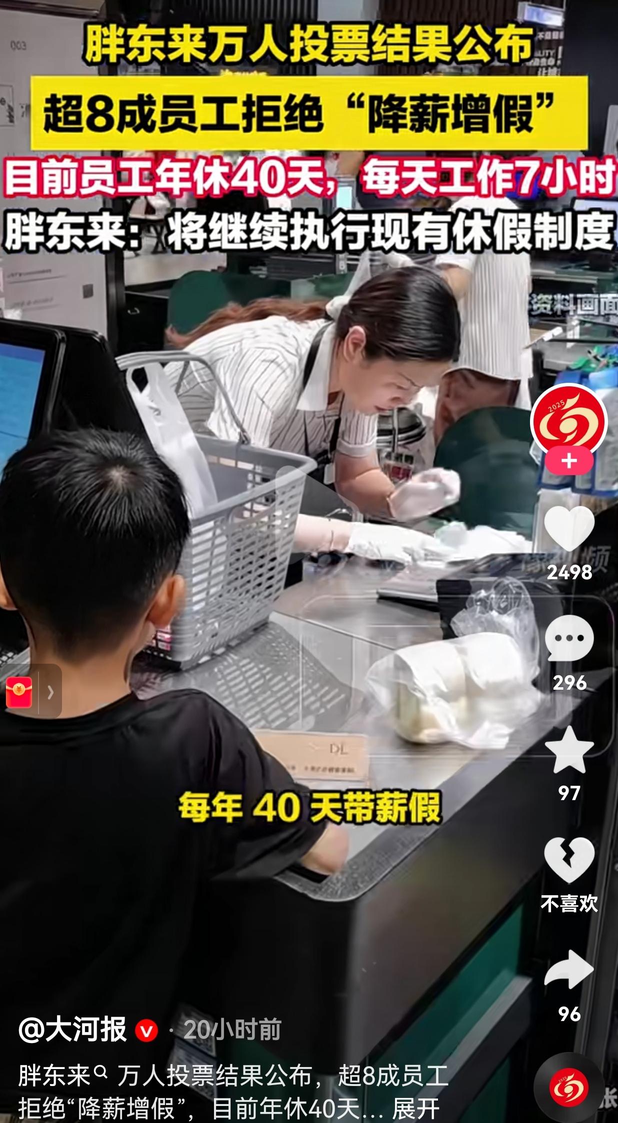 胖东来又上热搜!超8成员工拒绝“降薪增假”,这才是打工人最想要的答案。 事情是这样的:胖东来为了给员工提供更好的福利,提出了一个“降薪增假”的方案——简单说就是少拿点钱,多休几天假。 结果呢?在覆盖了1万多名员工的投票里,82.38%的人选择了拒绝,想要维持现在的制度。 现在胖东来员工的待遇是什么样? 每天工作7小时,每年带薪年假40天,还有各种让人眼红的福利和保障。 我看到这个数据的时候,第一反应不是“哇,他们好有钱”,而是“天呐,他们真的好幸福”。 你想想,现在多少打工人在996的泥潭里挣扎,在“35岁危机”里焦虑,在“五险一金”都没有保障的岗位上苟着。 我们天天喊着要“躺平”,要“反内卷”,可真当有一个机会摆在面前,让你少拿钱多休息的时候,胖东来的员工却用脚投票,选择了“维持现状”。 这说明什么?说明他们现在的生活,已经足够好了,好到他们根本不需要用“降薪”来换取更多假期。 为什么这么说呢?因为,数据不会骗人:超97%的员工认为,目前的休假能让他们有充足的休闲和生活幸福感。 近98%的员工,对现在每年40天的休假安排感到满意。 看到这组数据,我真的酸了。这哪里是在上班,这分明是在过日子啊! 于东来和他的团队,真的把员工当“人”看,而不是“工具人”。他们尊重每一个人的选择,把决策权交还给员工。 当老板提出“降薪增假”,员工说“不”的时候,老板没有生气,反而说:“好,那我们就继续执行现在的制度。” 这种双向奔赴的信任,才是最打动人的地方。 胖东来的存在,就像一面镜子,照出了我们这个时代大多数打工人的困境,也给了我们一个关于“理想工作”的答案。 对此,你怎么看?欢迎大家评论区讨论留言。