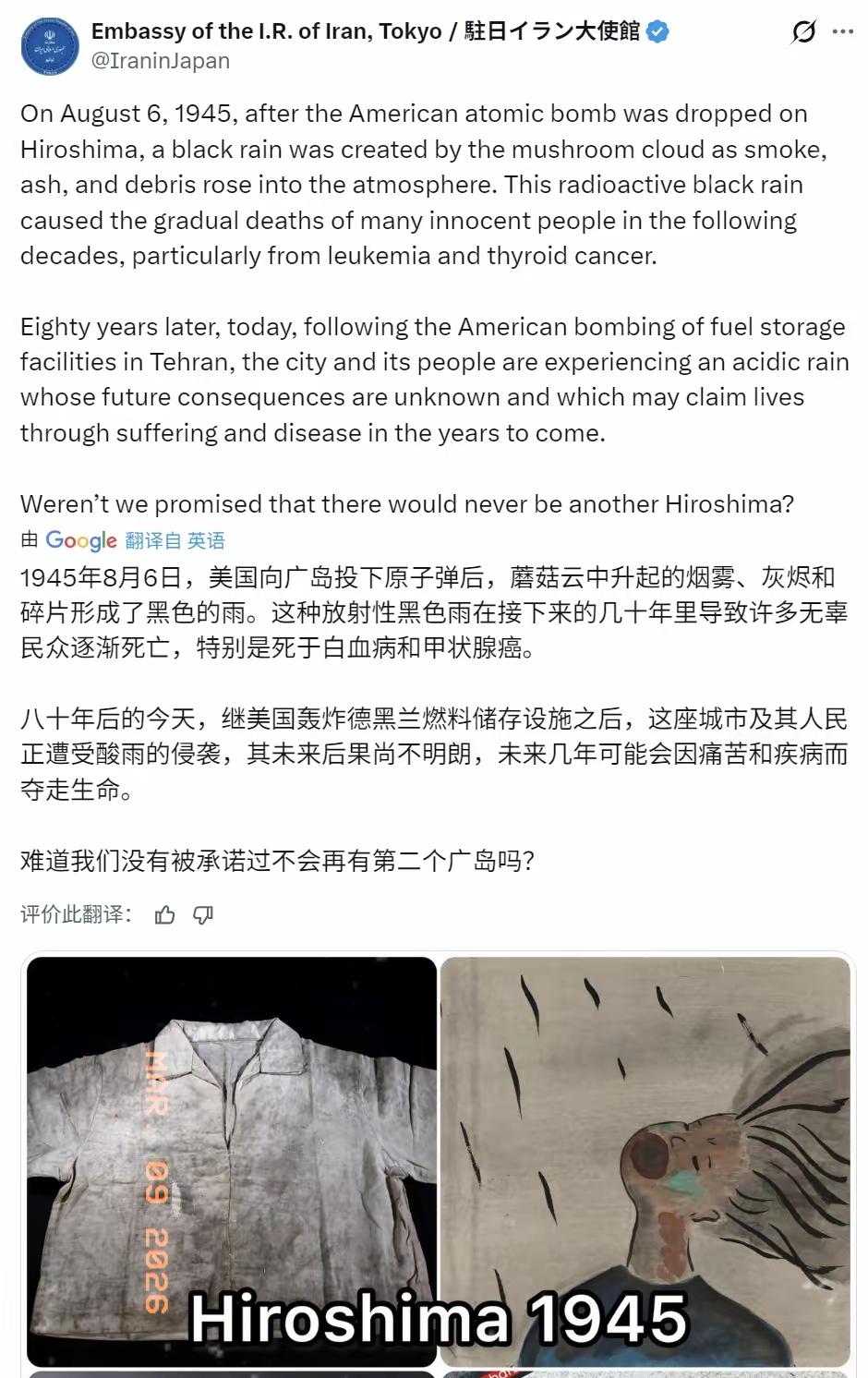 日本互联网炸锅! 3月8日伊朗驻日使馆发推(4万赞、80万阅读),痛批日本跪舔特朗普、忘却广岛黑雨悲剧,将广岛核爆与德黑兰遭美空袭后的酸性雨云对比,质问“说好不再有下一个广岛”。 伊朗这招精准戳中了日本最深的伤疤。广岛核爆80年了,那些被黑雨淋过的幸存者至今还在承受后遗症折磨。伊朗使馆这条推文直接把“酸雨”和“黑雨”划等号,用意再明显不过:你们日本最懂平民被炸的痛,怎么现在转头就装失忆? 日本网民炸锅不是因为被骂,而是因为没法反驳。高市早苗3月6日刚公开呼吁伊朗“保持克制”,可美以先动手炸了伊朗小学、死了上百孩子的时候,日本政府连句谴责都没有。东京街头一位大叔对着镜头直接开怼:“这话不应该对美国说吗?无辜的人一个接一个被杀,凭什么只让伊朗克制?” 真相扒开来更难看。3月3日德国总理默茨刚在华盛顿见完特朗普,两天后就给高市早苗打电话。电话打完,日本立刻改口,外相茂木敏充甚至用了“谴责”伊朗这种词。这哪是独立外交?分明是美国指令的精准传达。 日本民众不傻。有人翻出1953年的历史——那时候日本被西方封锁能源,是日章丸号油轮顶着制裁从伊朗运回原油,才保住战后那口气。现在倒好,为了讨好特朗普,73年的对伊关系说撕就撕。更讽刺的是,日本95%的原油进口要走霍尔木兹海峡,而这条海峡就在伊朗手里。 最扎心的是广岛原爆幸存者的反应。日本被团协负责人看到美以空袭伊朗后说:“世界正在坠入更深的混乱,这和幸存者渴望的无核无战争世界背道而驰。”伊朗使馆那条推文,等于把日本政府的双重标准钉在耻辱柱上——你们一边在广岛纪念仪式上念和平宣言,一边对美国轰炸别国装聋作哑。 广岛黑雨有毒,德黑兰酸雨也有毒。日本政府不敢质问美国,却指望伊朗咽下这口气。这种“和平叙事”选边站的操作,连自家老百姓都看不下去了。 各位读者你们怎么看?欢迎在评论区讨论。