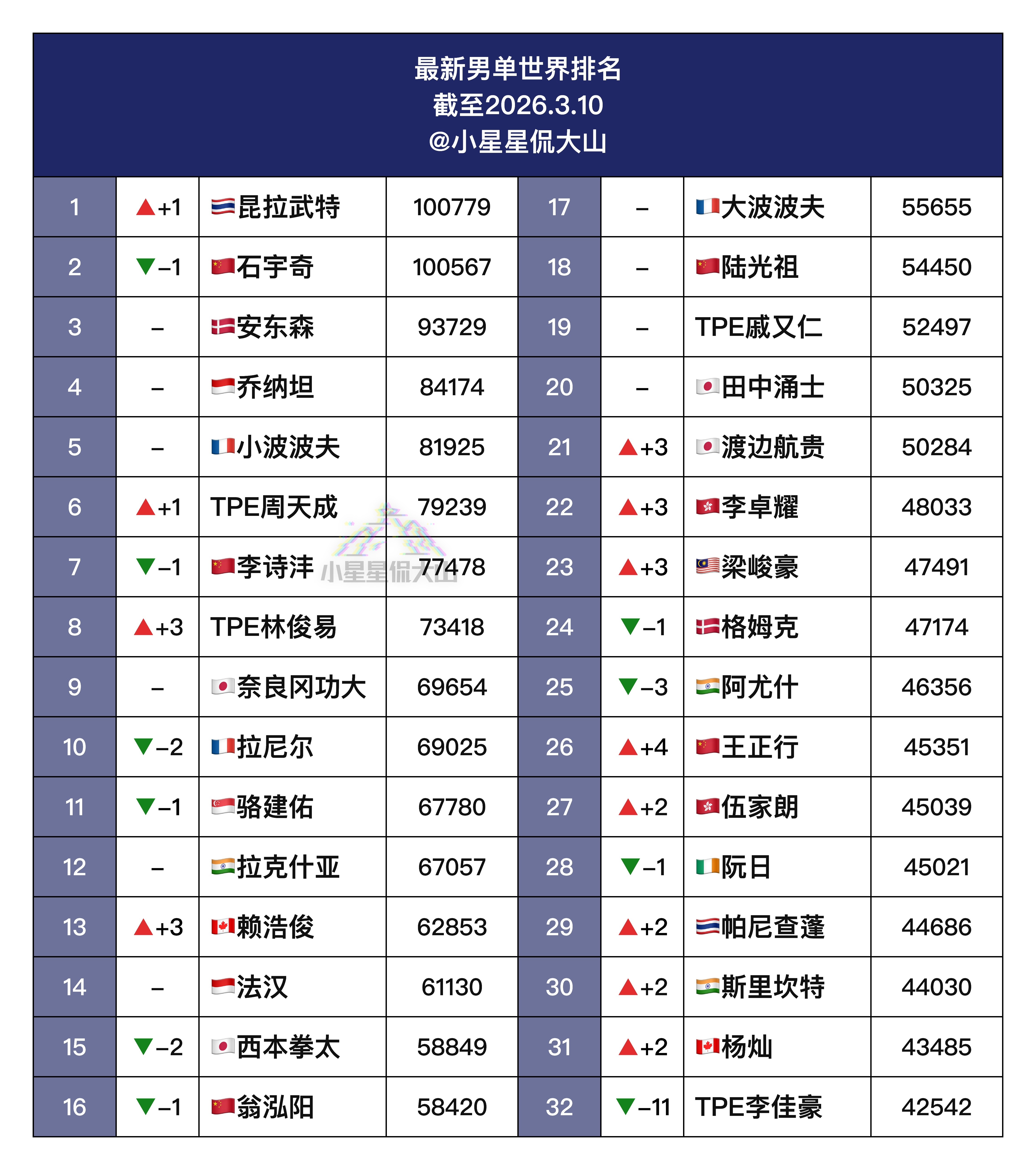 【最新男单世界排名】🇹🇭昆拉武特 2➡️1🇨🇳石宇奇 1➡️2🇨🇳李诗沣 6➡️7🏆林俊易 11➡️8🥈拉克什亚 12🇨🇳翁泓阳 15➡️16🇨🇳陆光祖 18🇨🇳王正行 30➡️26中国羽毛球队2026全英羽毛球公开赛