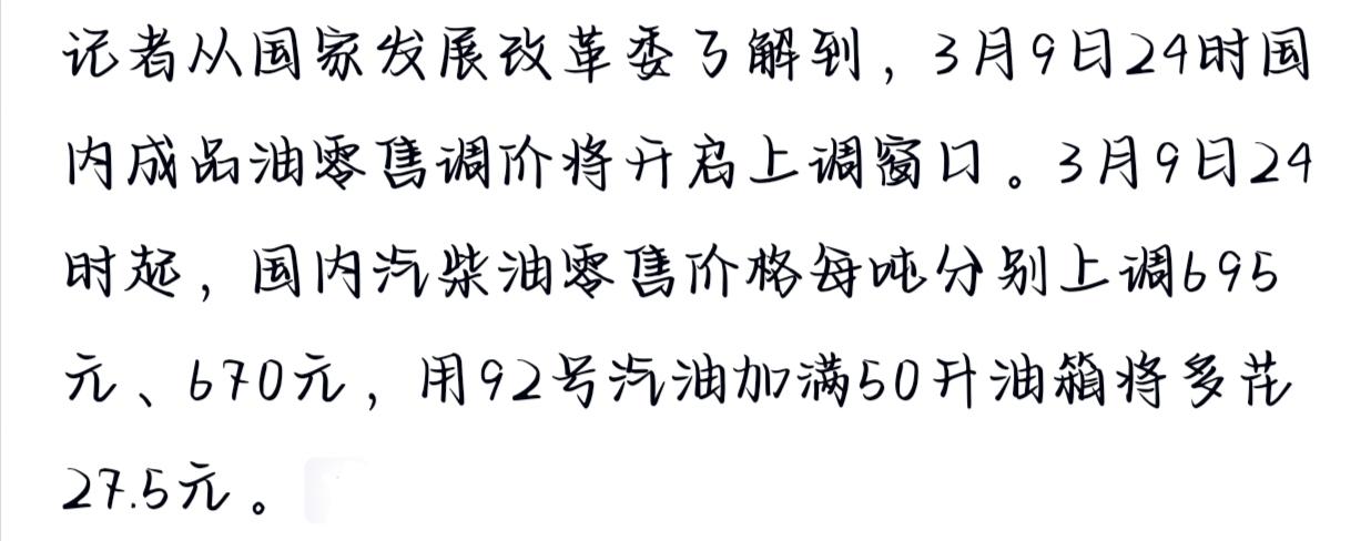 油价“暴力”上调, 一箱油多花27.5元。 今晚油价真的要涨了,而且涨得让人肉疼!据最新消息,本轮成品油价格调整窗口即将打开,涨幅惊人。算下来,咱们普通家用车加满一箱50升的92号汽油,得多掏出27.5元。 这可不是小数目,相当于一顿午饭钱就这么没了。这次上调的原因,主要还是国际原油价格持续走高,加上国内成品油调价机制跟进。今年以来,油价就像坐了火箭,涨多跌少,物流成本、出行成本都在蹭蹭往上涨。 对于咱们车主来说,以后出门得好好规划路线了,能省则省。毕竟这年头,除了工资不涨,啥都在涨。趁着还没到加油站排长队,赶紧去加满吧!油价最新消息 油价调价时间表 国际油价巨震