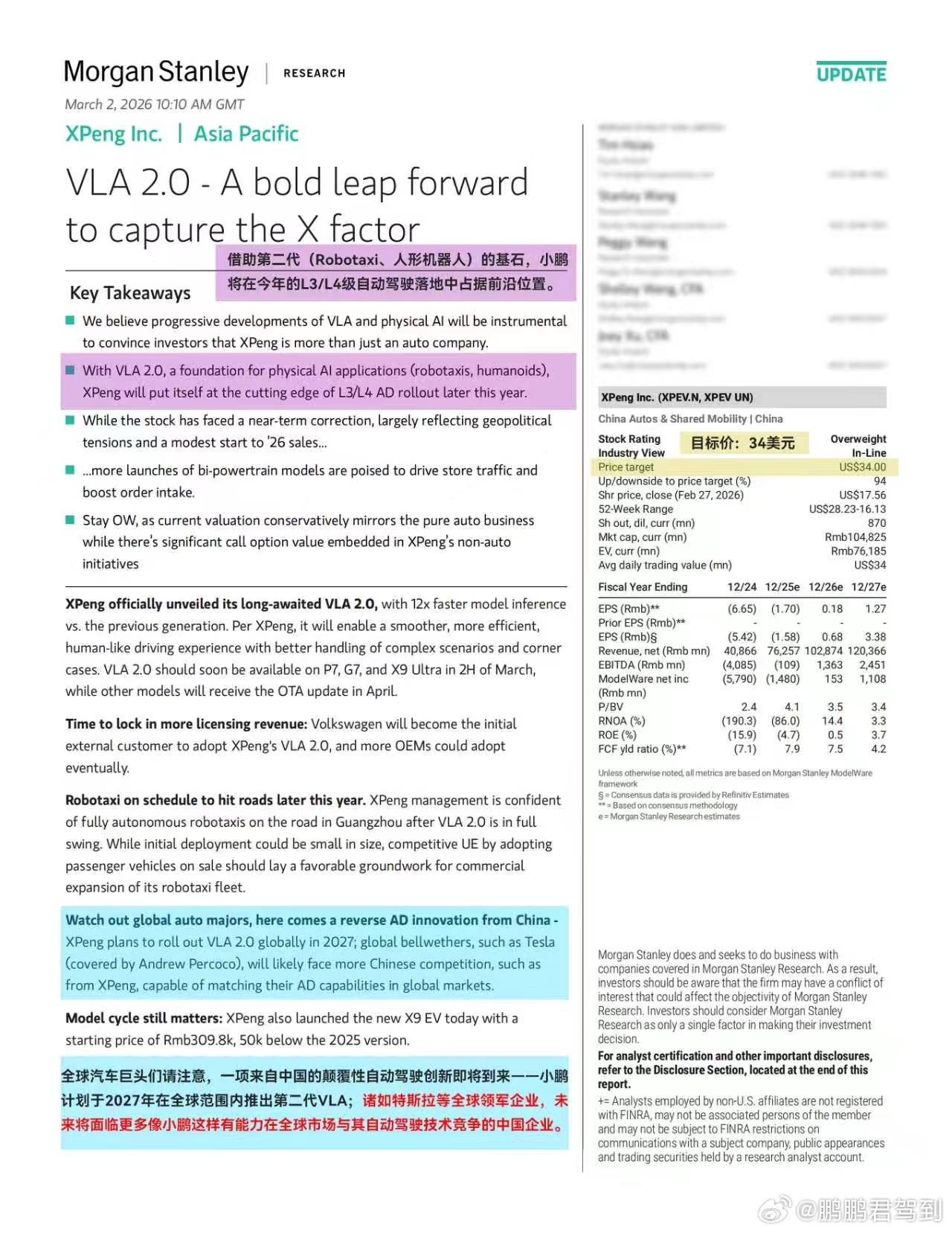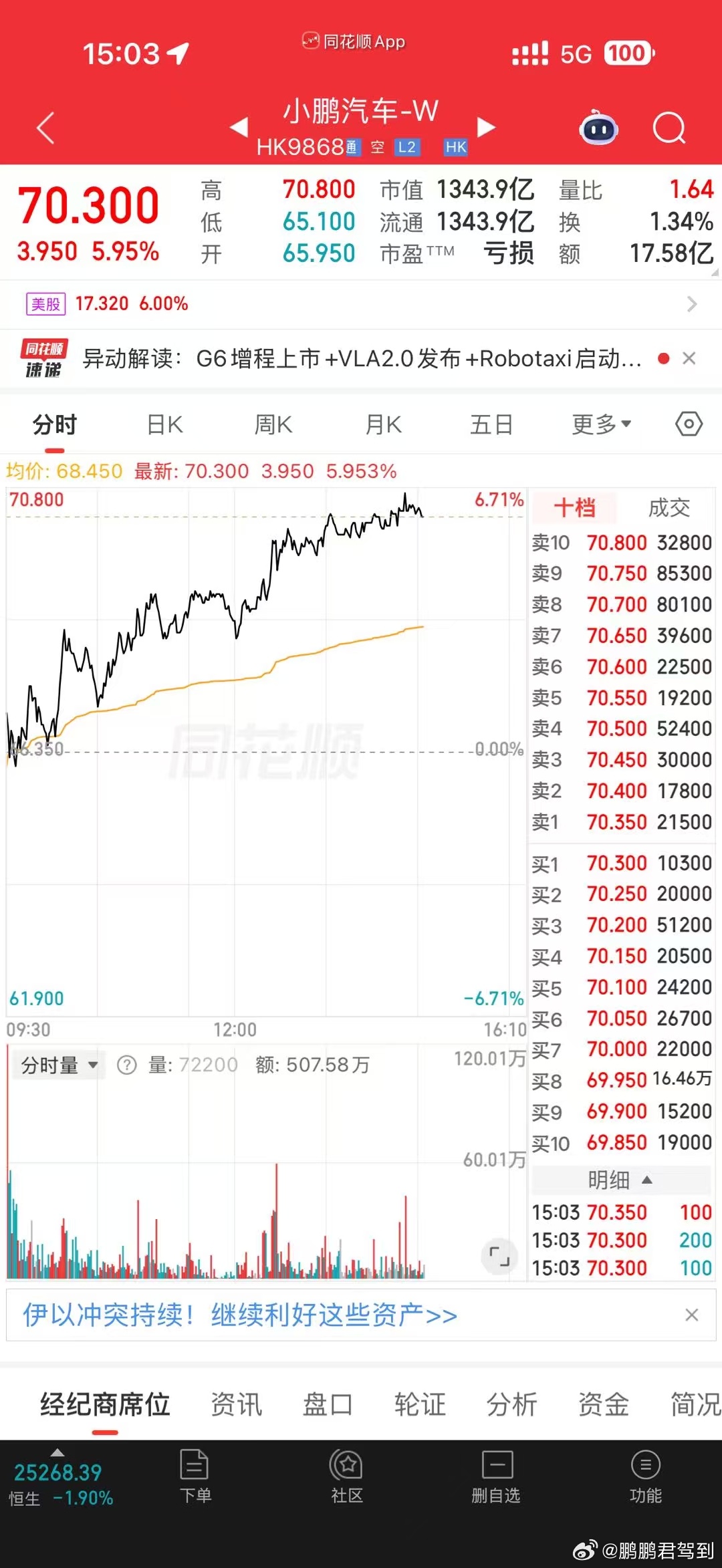 【市场消息:小鹏第二代VLA广州投资人试驾反馈积极,股价午后逆势走强】小鹏汽车大涨近6% 3月9日,港股小鹏汽车-W(9868.HK)午后持续拉升,盘中涨幅一度接近6%,股价突破70港元关口。当日港股整体走势偏弱、美股期指普遍下行,小鹏汽车却逆势走高。市场消息称,小鹏汽车今日在广州组织第二代VLA投资人试驾体验,多家国内外机构参与调研。部分投资人反馈称,在复杂城市道路测试中,智能驾驶表现稳定,在部分路段通行效率甚至优于出租车司机驾驶水平。机构方面,摩根士丹利近期在研报中表示,小鹏第二代VLA代表智能驾驶的重要跃迁,并认为未来全球自动驾驶竞争中,特斯拉将面临来自中国科技企业的直接竞争。