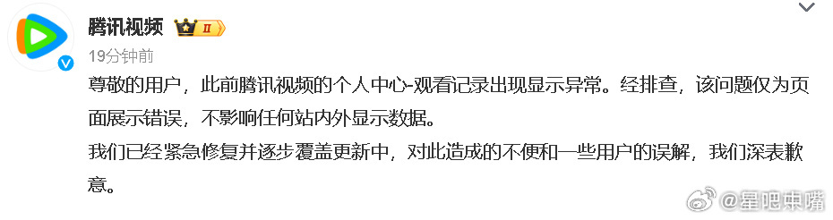 腾讯视频回应播放异常“经排查,该问题仅为页面展示错误,不影响任何站内外显示数据”