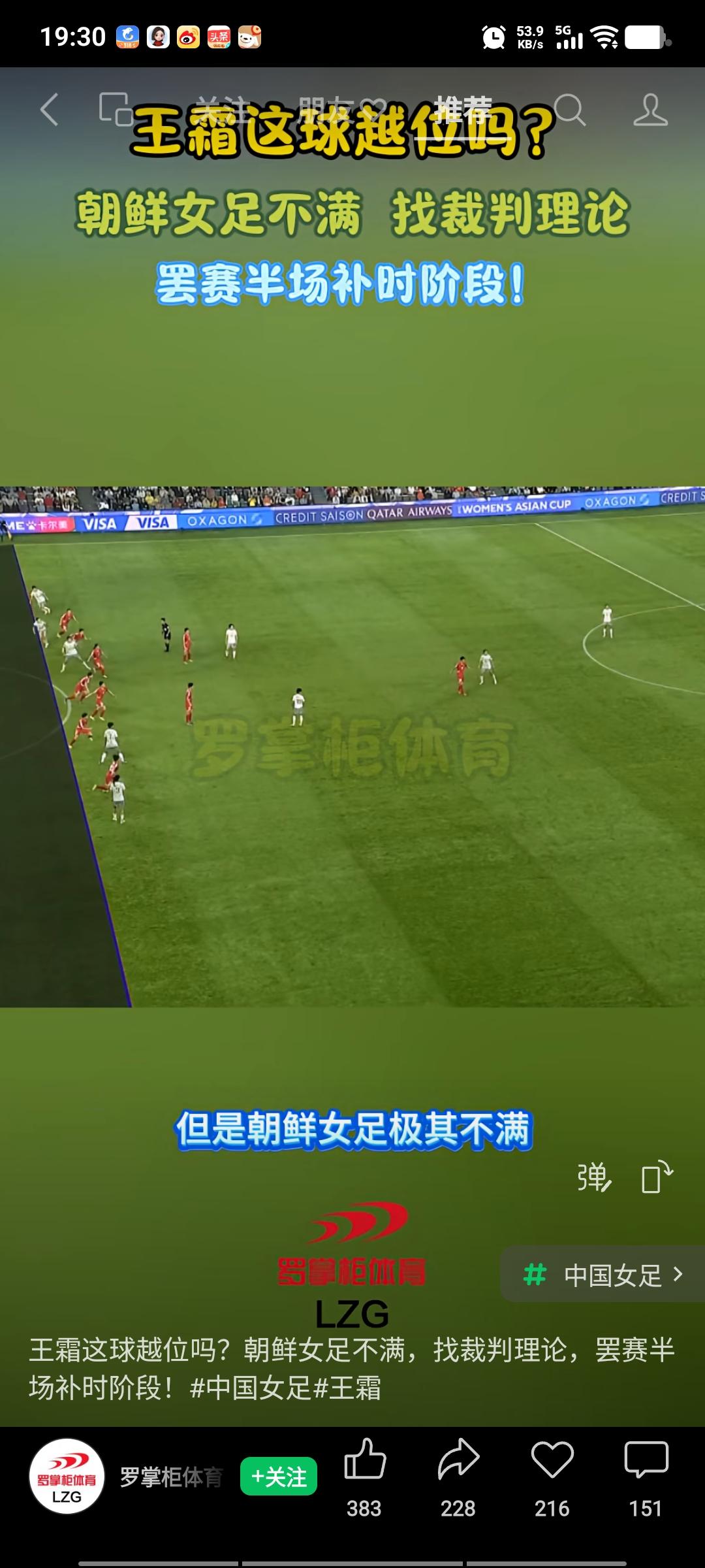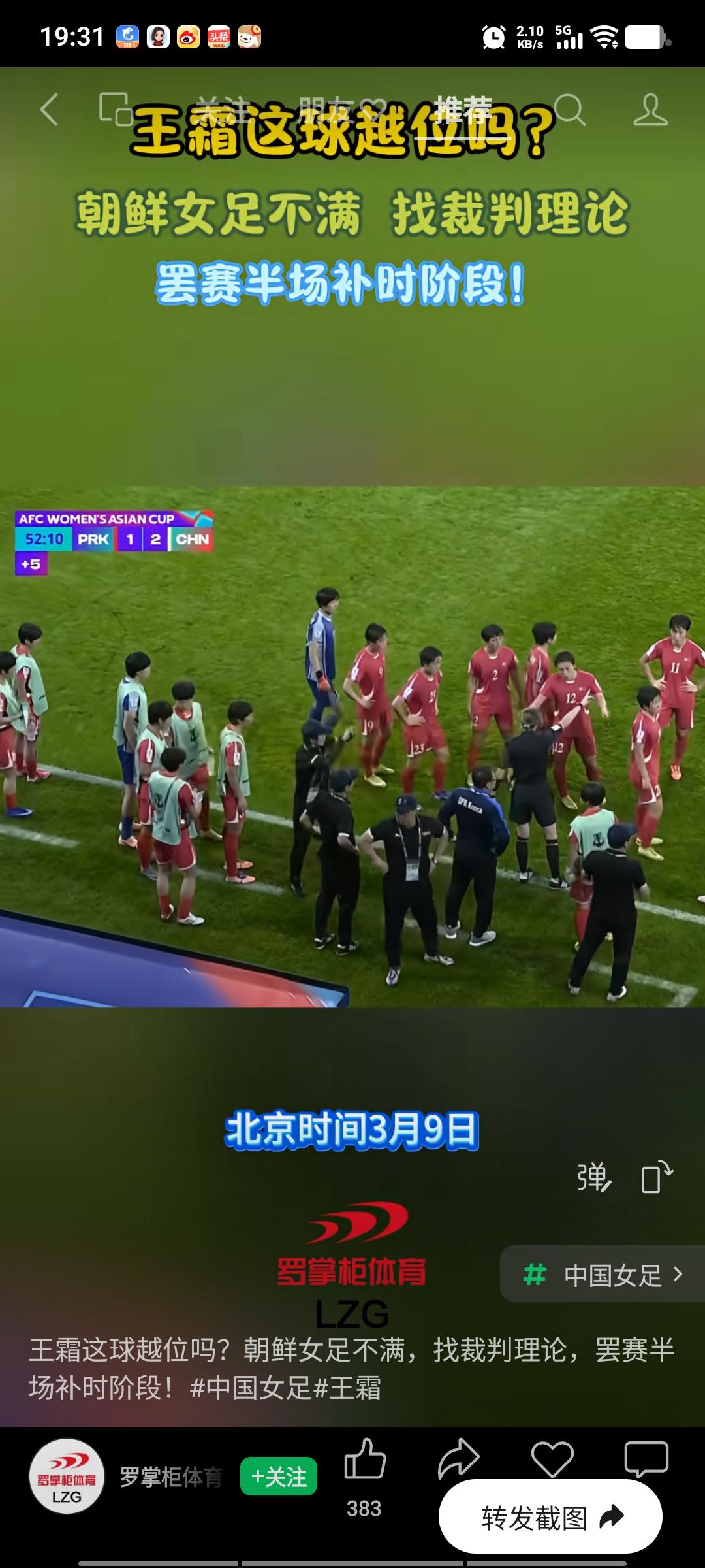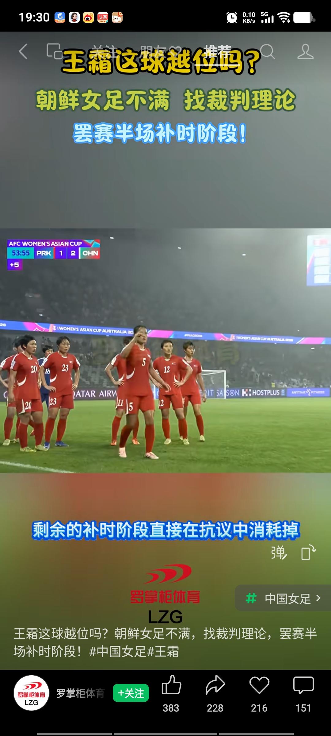 中朝女足比赛在上半场补时阶段,出现了一段小插曲。王霜攻入一记反越位进球,经VAR回看,此球并未越位,进球有效。这一判罚激起了朝鲜队的集体抗议,其主教练还被出示黄牌。随后,朝鲜队以罢赛的方式耗完了剩余时间,主裁判直接吹响了上半场结束的哨声。 预计接下来,亚足联还会追加处罚。赛场风气不可助长罢赛行为,赛场上必须尊重裁判判罚,采取罢赛的方式,必然会面临罚款处理。