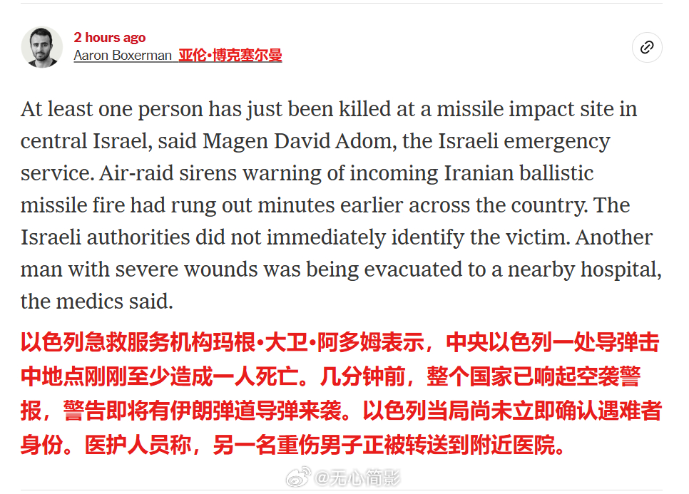 《纽约时报》的消息,刚才以色列又在伊朗袭击中至少一人死亡