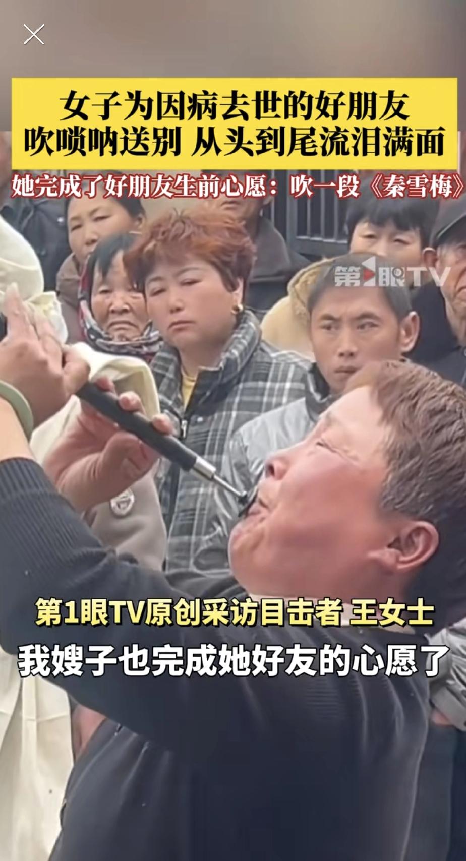 哭着吹完《秦雪梅》,这是她答应好朋友的事。“我满足了好朋友的心愿,送她最后一程,我也了了一个心愿。” 这句话是一个河南女子事后说的。前几天,她站在好朋友的葬礼上,手里握着唢呐,吹了一曲《秦雪梅吊孝》。 两个人相识快50年了 。年前好友跟她说:等哪天我走了,你给我吹一段这个,送送我。她答应了。 葬礼那天,唢呐声一响,她就哭了。眼泪顺着脸往下淌,但她没停。 闭着眼吹,快撑不住的时候睁开缓一下,接着吹 。曲子不能断,这是两个人的约定。 《秦雪梅》是传统戏里的悲调,讲的是秦雪梅吊唁亡夫的故事,被称为“十大悲剧”之一 。 她吹的时候,旁边的人都看着。有人拍下来发到网上,评论区很多人说:看她眼角的泪,我也哭了。 人这一辈子,最后能被记住的,可能不是多风光的事,而是还有人愿意为你哭着吹完一段曲子。