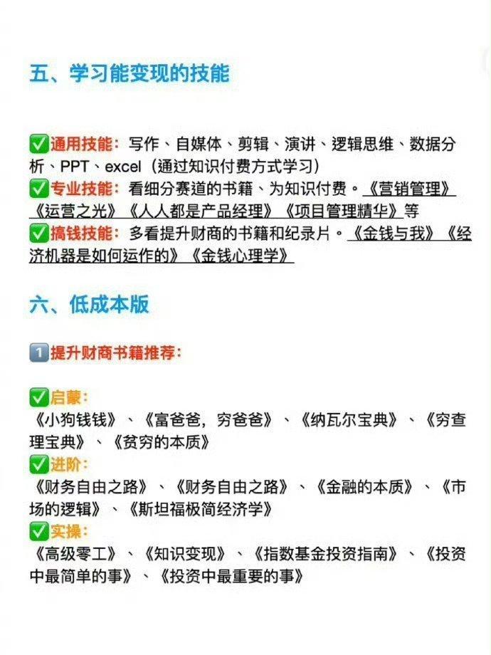 人生建议:一定要去离钱近的工作岗位 真心建议:去离钱近的行业、岗位 一、选择在风口期的行业、赛道 2026高薪热门行业/赛道: AI /新能源/互联网+/自媒体/快消/旅游/医/大健康/低碳/芯片/数字化/银发经济/宠物/产业互联网/快消/云计算和云服务/出海 【优先级排序】行业>公司>岗位 二、离钱近的岗位 第一梯队:产品|运营|研发|算法|投资|战略|市场|公关|商务 BD |大客户销售|供应链采购|法务|人力|数据分析|咨询 第二梯队:项目管理|总助|风险管理|质量管理|设计类|测试类|内部 IT |零售销售( ToC )|财会审计 三、这些岗位又累钱又少,真心不建议长期做 《行政|后勤|文员|内勤|客服|非技术支持类|纯电销|网 销 四、怎么选到神仙好公司 1)跟着资本走。被大资本青睐的公司业务处在高速发展期,新放出来的岗位多,舍得给高薪。 红杉资本、高瓴、君联、 IDG 、软银。方法:直接网页搜索投资公司名称,官网查看对外投资信息。 2)找独角兽公司。估值10亿美及以上且未上市的公司.这些公司发展潜力巨大,基本都是新兴的赚钱行业,比如人工智能、智能驾驶 可以看《胡润研究院独角兽报告》 3)看研报分析、行业报告。了解各行各业怎么赚钱的,商业模式。这几个10个渠道就够了: √行业报告:阿里研究院,36氪研究院,洞见研报,艾媒网√媒体资讯:虎嗅,钛媒体,华尔街见闻,艾瑞网,亿欧 数据库渠道汇总: √宏观数据: wind 、国家统计局、萝卜投研、中经网、数据汇√财务数据:东方财富网、上市公司官网财报、见微数据√工商信息:企查查、天眼查 五、学习能变现的技能 通用技能:写作、自媒体、剪辑、演讲、逻辑思维、数据分析、 PPT 、 excel (通过知识付费方式学习) 专业技能:看细分赛道的书籍、为知识付费。《营销管理》《运营之光》《人人都是产品经理》《项目管理精华》等 搞钱技能:多看提升财商的书籍和纪录片。《金钱与我》《经济机器是如何运作的》《金钱心理学》 六、低成本版 1提升财商书籍推荐: 启蒙: 《小狗钱钱》、《富爸爸,穷爸爸》、《纳瓦尔宝典》、《穷查理宝典》、《贫穷的本质》 进阶: 《财务自由之路》、《财务自由之路》、《金融的本质》、《市场的逻辑》、《斯坦福极简经济学》 实操: 《高级零工》、《知识变现》、《指数基金投资指南》、《投资中最简单的事》、《投资中最重要的事》 六、低成本版 1提升财商书籍推荐: 启蒙: 《小狗钱钱》、《富爸爸,穷爸爸》、《纳瓦尔宝典》、《穷查理宝典》、《贫穷的本质》 进阶: 《财务自由之路》、《财务自由之路》、《金融的本质》、《市场的逻辑》、《斯坦福极简经济学》 实操: 《高级零工》、《知识变现》、《指数基金投资指南》、《投资中最简单的事》、《投资中最重要的事》 2提升财商纪录片推荐: 1、《为什么贫穷》9.1分 2、《十分钟速成课:经济学》9.3分 3、《致富之道》8.4分 4、《无节制消费的元凶》8.8分5、《与全世界做生意》8.8分6、《金钱与我》8.2分7、《成为沃伦巴菲特》8.7分8、《富豪谷底求翻身》9.1分9、|《致富之道》8.4分