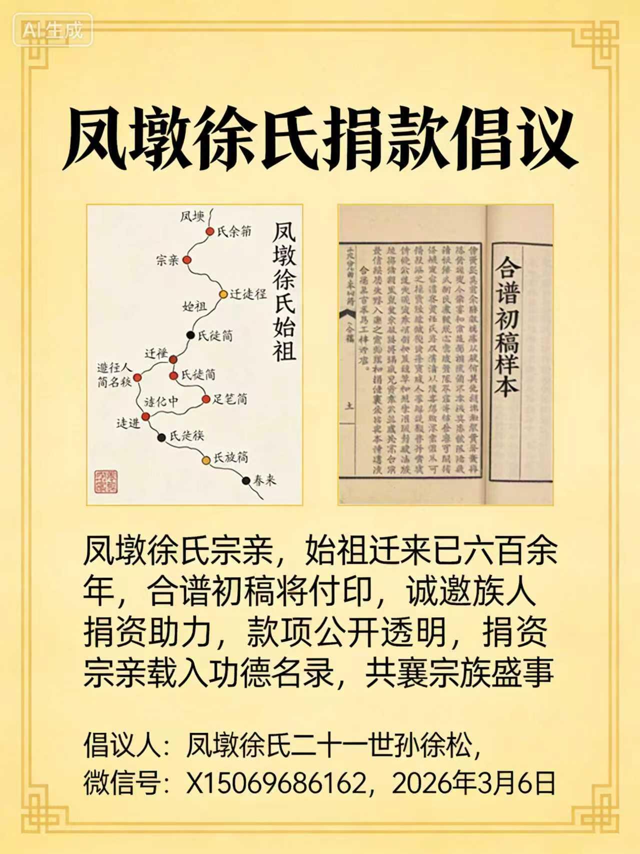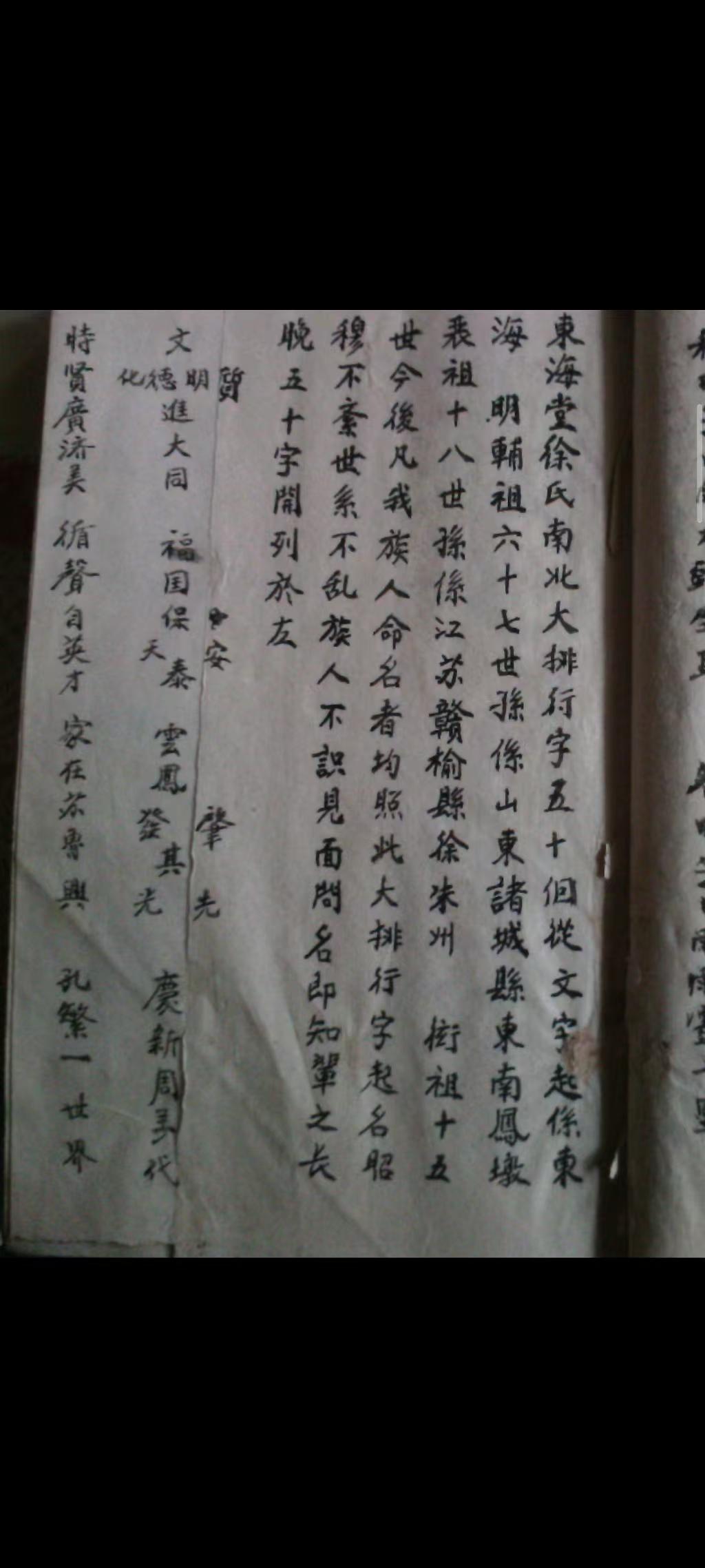 东海堂凤墩徐氏·源流简介 东海堂徐氏始祖徐明辅,原籍陕西长安五陵,秦时官拜东海边郡长史,秦末避乱隐居东海云台西坡当路徐家大村,世代守谱耕读。 大宋末年,四十七世孙徐善堂任职山西大同,携谱赴任,城陷族谱遭焚,先世名讳无考,后世公推善堂公为宗家始祖。善堂公生徐从圣,从圣生徐元文、徐元武;元文生仁龙、义龙、礼龙,元武生智龙、信龙、惠龙,家族枝繁叶茂。 元末战乱,东海遭“红军赶散”,徐氏族人于喜鹊窝树下分迁避难,以喜鹊窠为一脉相认之记。其中礼龙公(后改名徐聚,字复初)于明洪武二年迁居山东诸城县东南海上凤墩庄,为凤墩徐氏始迁祖,其余族人分迁海州、赣榆、临洪、河南、沭阳等地。 民国十八年(1930年),南北九县族人合修总谱,自明辅祖六十七世起,拟定统一字辈五十字:文德进大同,福国保安泰;云风璧其光,庆新周万代;时贤广济美,循声自英迈;家在苏鲁兴,孔繁一世界;怀祖念厚图,群宗博以爱,世代传承,绵延至今。