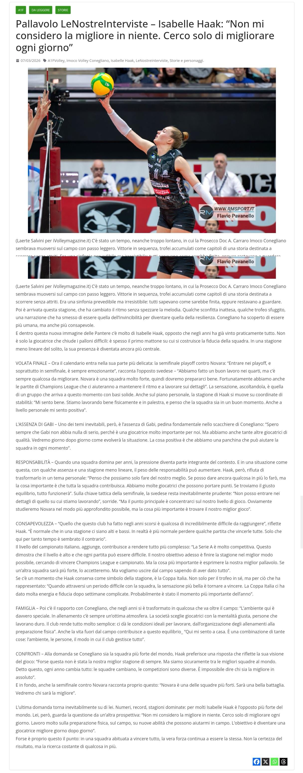 哈克专访:我不认为自己在任何方面是最优秀的,我只是努力每天进步 不久之前,Prosecco DOC A. Carraro Imoco Conegliano 似乎在球场上轻盈如飞。连连的胜利,奖杯的累积,如同故事中一页页流畅展开的篇章。这首交响曲看似平淡却又令人无法抗拒:每个人都知道结局,却依然驻足观看。然而,本赛季的到来改变了节奏,却并未破坏旋律。几场意料之外的失利,几座来之不易的奖杯,让这支球队的故事不再是不可战胜的,而是关于韧性的故事。Conegliano 发现,这支球队更加人性化,也更加清醒。 在这支焕然一新的“黑豹”中,伊莎贝尔·哈克(Isabelle Haak)的身影占据了重要位置。这位接应二传手多年来几乎赢得了所有荣誉。她不仅仅是那个能终结高难度球的球员,她往往也是球队建立信心的基石。在这个赛季的发展轨迹不如往常那样清晰明了的情况下,她的存在变得更加至关重要。 最后冲刺——赛程进入最关键的阶段:与诺瓦拉的季后赛半决赛。“进入季后赛,尤其是半决赛,总是令人兴奋,”这位瑞典接应二传手说道。“我们在四分之一决赛中表现出色,但总有进步的空间。诺瓦拉是一支非常强大的队伍,所以我们必须做好充分的准备。幸运的是,我们还有欧冠联赛的比赛,这有助于我们保持状态并完善细节。”听她这么说,你会觉得这支队伍已经打下了坚实的基础。就个人而言,哈克的赛季也进展顺利:“我感觉很好。我们在体能训练和训练馆训练方面都做得很好,我认为球队状态不错。就我个人而言,我也感觉很积极。” 加比缺阵——然而,不可避免的问题是加比的缺席,她是科内利亚诺队的关键球员:“我一直希望加比没什么大碍,因为她对我们来说非常重要。但我们还有很多其他优秀的球员。我们会每天观察情况的发展。好的一方面是,我们有替补球员,她们随时都能帮助球队。” 责任——当一支球队多年称霸赛场时,压力便会成为其不可或缺的一部分。而像现在这样,由于一些球员缺阵,加上赛季表现不够稳定,责任的重担可能会加重。然而,哈克拒绝将此视为个人问题:“我认为我们只能尽力而为。如果我能做得更多,我会的,但重要的是全队都能有所贡献。我们有很多球员都能得分。如果我们能找到合适的平衡点,一切都会顺利。”谈到半决赛的战术,这位瑞典球员依然保持着谨慎的态度:“我不能透露我们正在研究的具体内容,”她笑着说。“但最重要的是专注于我们自身的比赛水平。当然,我们会尽可能深入地研究诺瓦拉的比赛,但最重要的是找到我们最佳的比赛状态。” 哈克感慨道:“近年来,这家俱乐部取得的成就实属不易。一个赛季有起有落是很正常的。事实上,输几场比赛比全胜更常见。只是在这里,很长一段时间以来,情况似乎恰恰相反。” 她补充说,意甲联赛的高水平也让一切变得更加复杂:“意甲竞争非常激烈。这表明联赛水平很高,每一场比赛都可能很艰难。我们现在的目标是以最佳状态结束这个赛季,力争赢得欧冠和联赛冠军。但最重要的是发挥出我们最好的水平。如果其他球队更强,我们会接受。但我们希望离开球场时,能够确信我们已经竭尽全力。” 如果说哈克认为本赛季有一个标志性时刻,那就是意大利杯。不仅仅是奖杯本身,更是它所代表的意义:“当球队经历一段艰难时期时,最好的感觉莫过于再次赢得冠军。意大利杯的胜利在经历了几周的低谷后给了我们很大的能量和信心。这或许是今年最重要的时刻。” 家庭——此外,还有与科内利亚诺俱乐部的关系,这种关系多年来已经超越了球场:“这里的氛围真的很特别。训练时总是充满热情。俱乐部挑选球员时注重培养正确的心态,他们勤奋努力。俱乐部为我们提供了很多便利:从训练安排到体能训练,都为我们提供了理想的训练条件。” 甚至场外生活也为这种平衡做出了贡献:“我在这里感觉就像在家一样。这源于很多因素:环境、人际关系,以及俱乐部的管理方式。” 比较——当被问及科内利亚诺是否是世界上最强的球队时,哈克给出了一个更能体现她比赛理念的答案:“也许这并非我们有史以来最好的赛季。但我们绝对是世界顶尖球队之一。话虽如此,每年情况都在变化:球队会变,比赛也会变。所以很难说谁才是最强的。” 最终,与诺瓦拉的半决赛也说明了一切:“诺瓦拉是实力最强的球队之一。这将是一场精彩的较量。让我们拭目以待,看看谁才是最终的赢家。” 最后一个问题最终还是回到了她身上。数据、纪录、统治级的赛季:在许多人眼中,伊莎贝尔·哈克是世界上最好的接应二传手。然而,她却从另一个角度看待这个问题:“我不认为自己在任何方面都是最好的。我只是努力每天进步。我努力训练体能,在球场上刻苦练习,学习能帮助我在场上发挥的新技能。我的目标是每天都变得更好。” 或许这正是关键所在:在一支习惯于赢得一切的球队中,真正的力量始终如一。不是对胜利的笃定,而是对更高目标的不断追求。 来源:意大利《排球杂志》