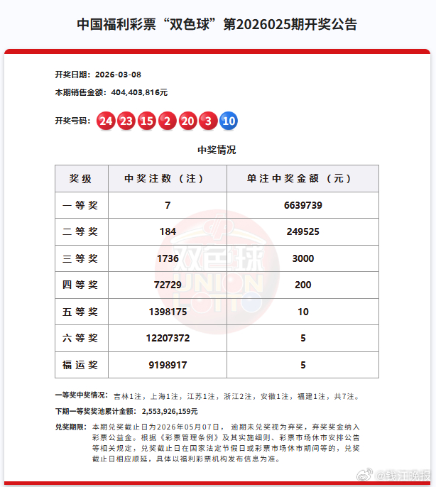 3月8日晚,双色球第2026025期开奖,号码为:02、03、15、20、23、24+10。全国共中出7注一等奖,分别出自:吉林(1注)上海(1注)江苏(1注)浙江(2注)安徽(1注)福建(1注)。