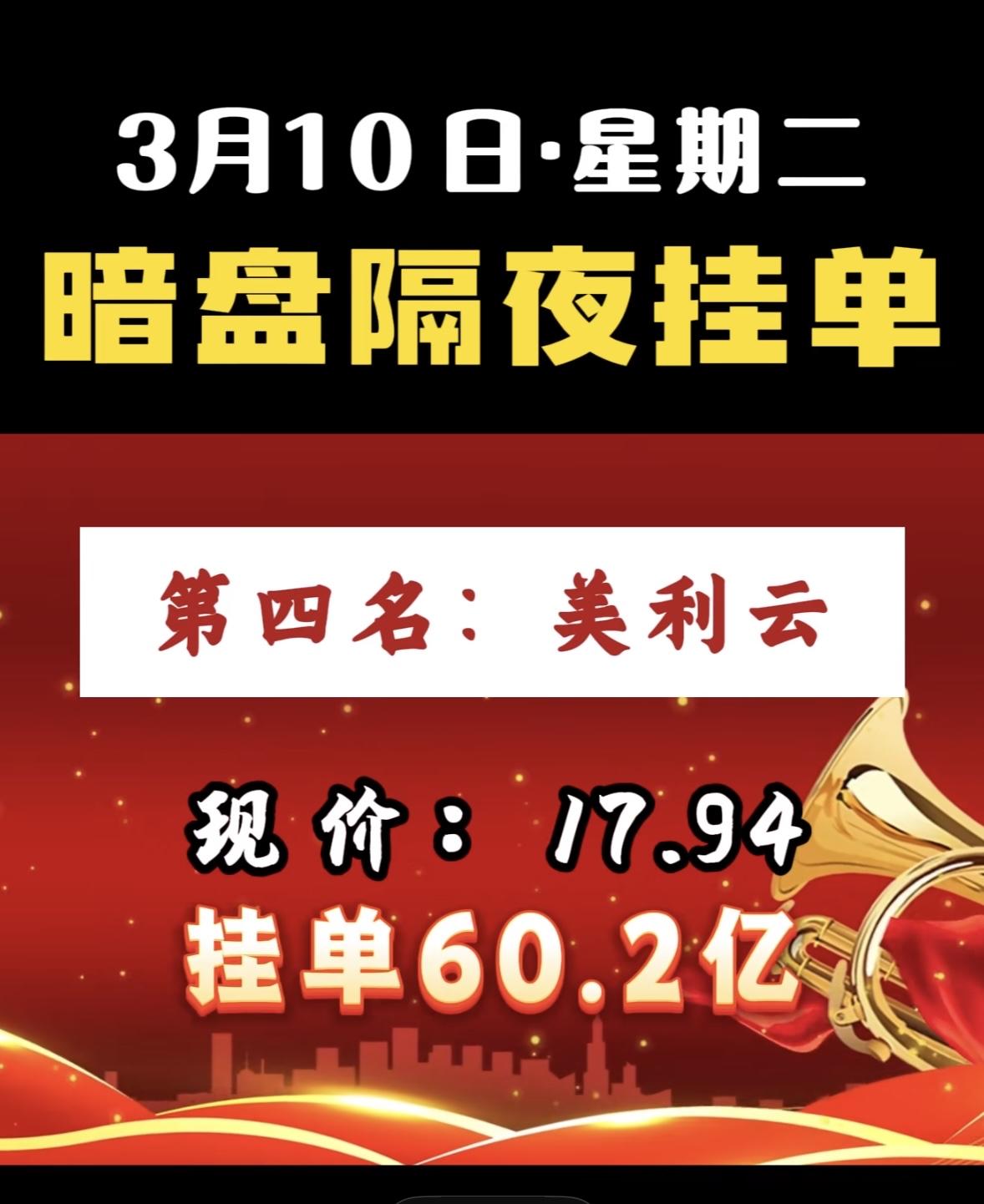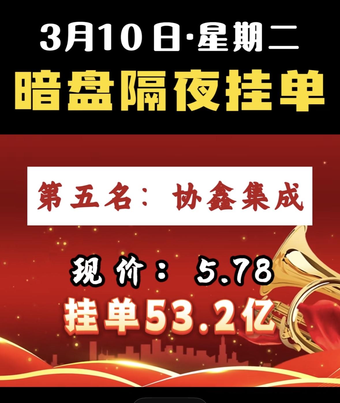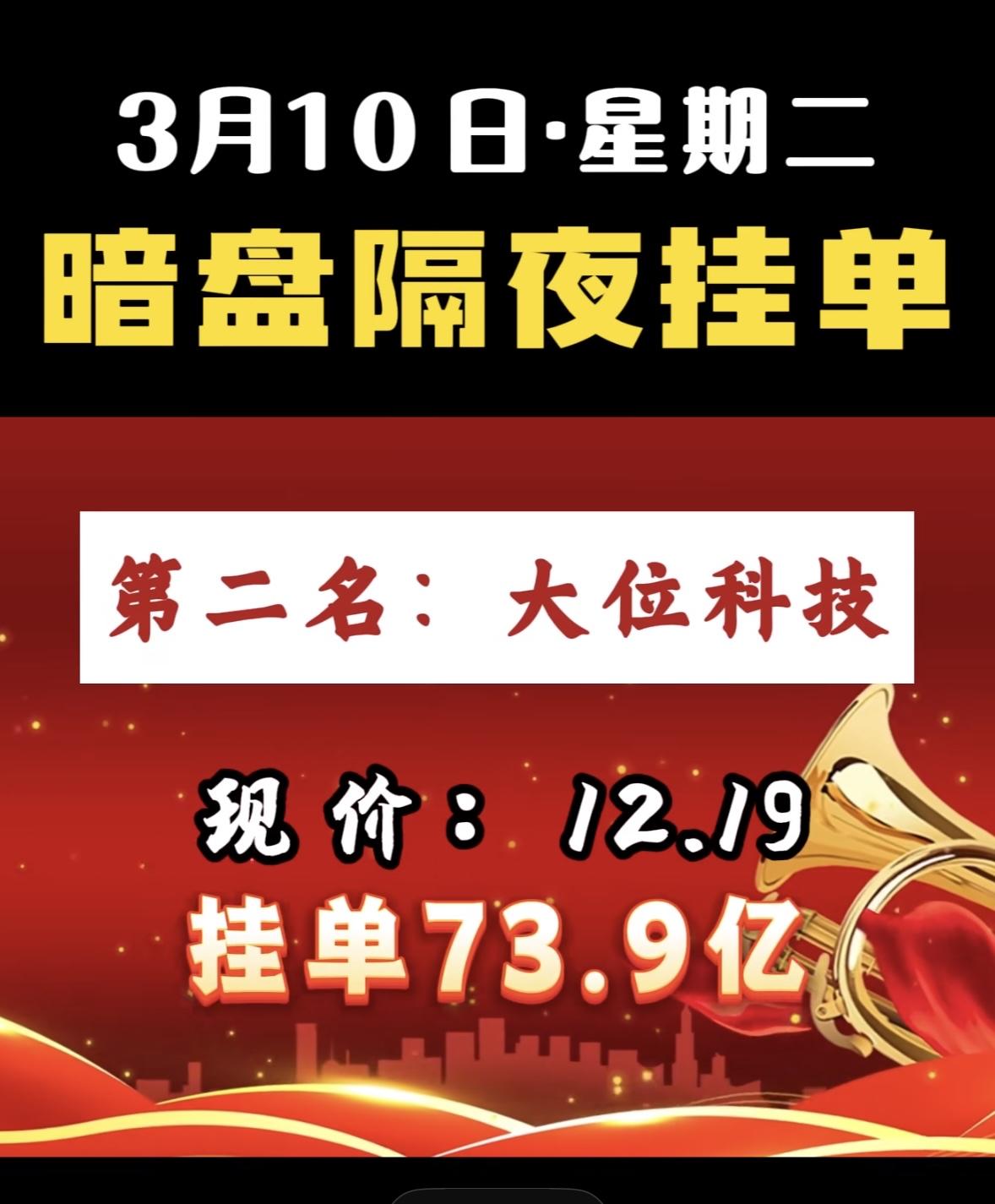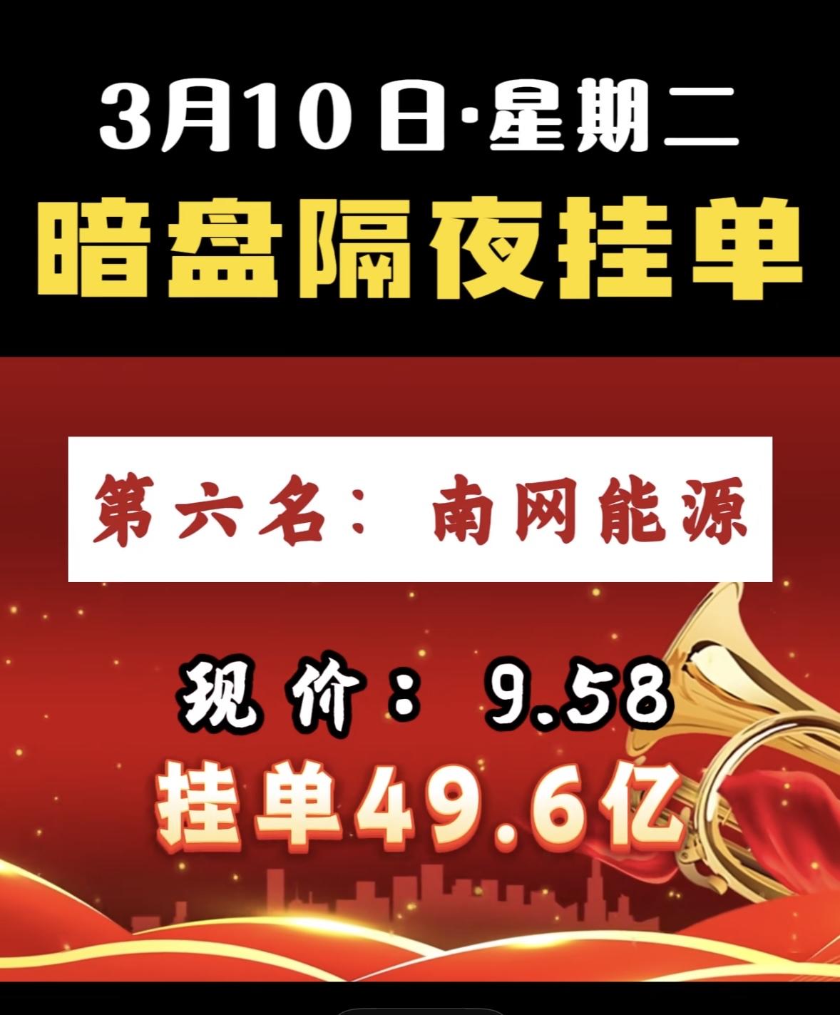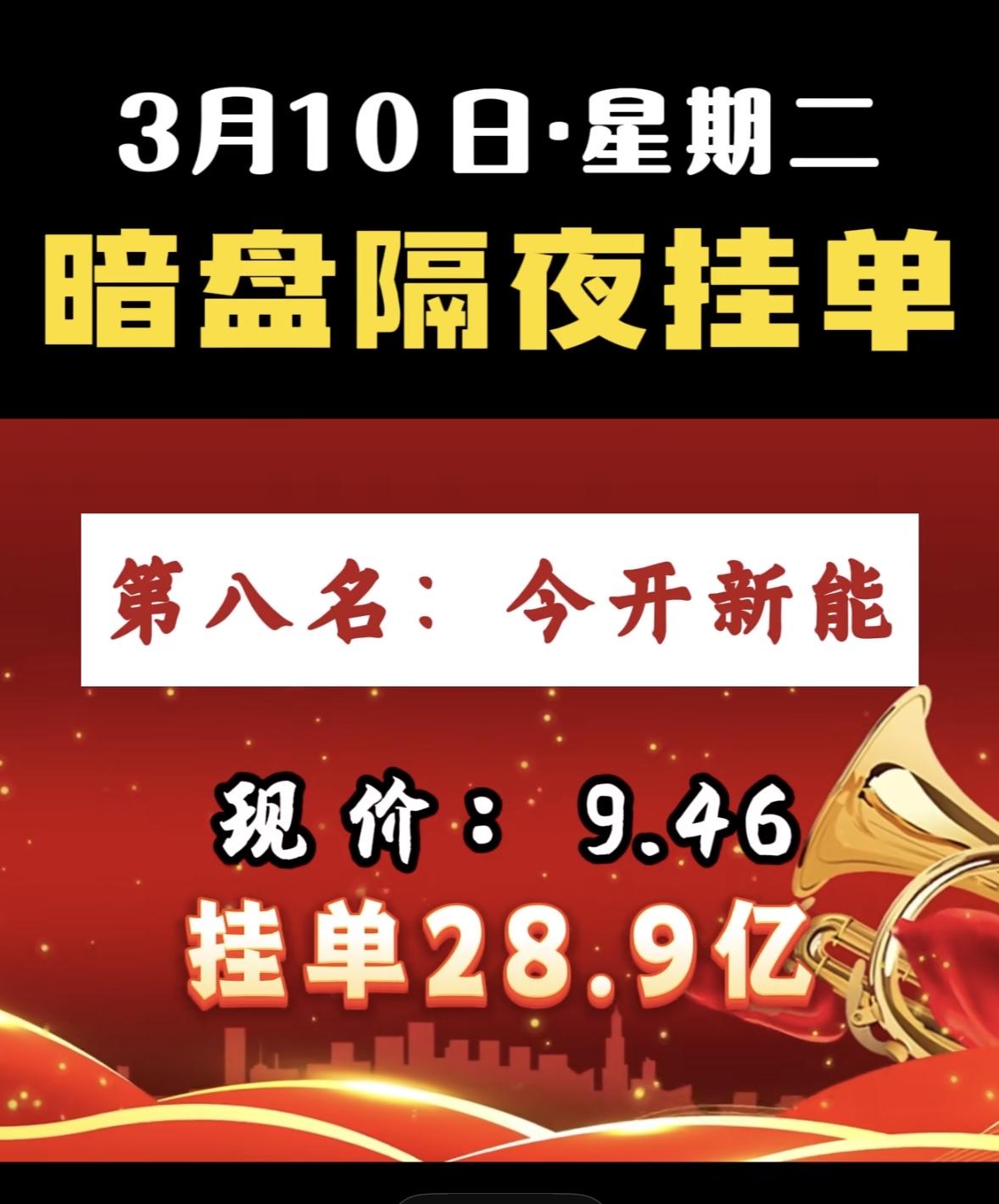 3月10日暗盘隔夜挂单前8名个股揭晓。 第八名今开新能,现价9.46,挂单28.9亿 科技股龙头暗盘挂单火爆,资金抢筹迹象明显,市场热度持续攀升。
