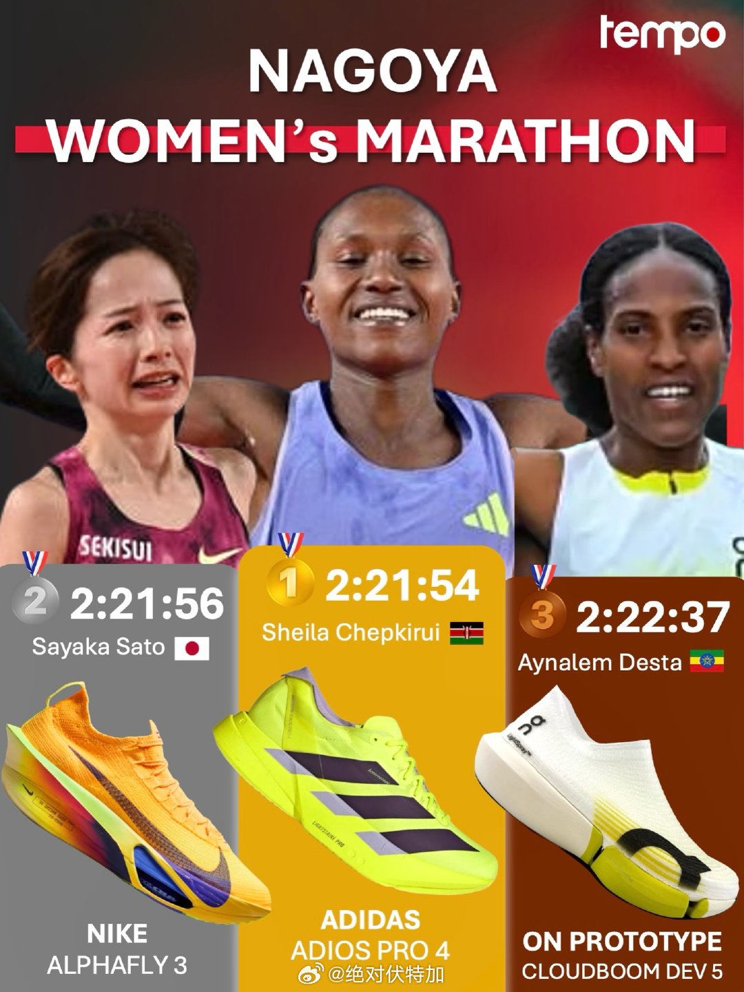 2026名古屋女子马拉松前三名跑步用鞋,以及前田穗南的定制亚瑟士鞋(换了 Sortie 鞋面的 Metaspeed 系列)。On昂跑的 Cloudboom DEV 5 在世界田联挂号一段时间了,应该算是第一次重要赛事站台吧。