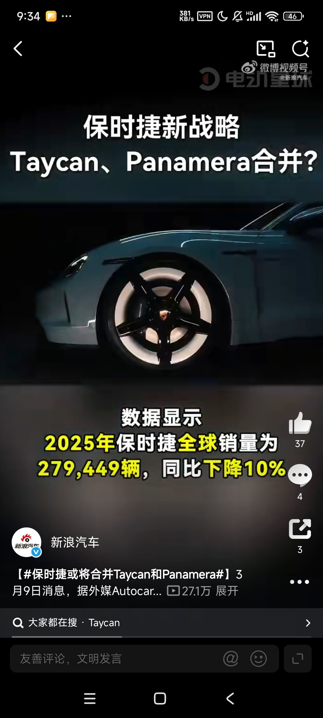 【保时捷或将合并Taycan和Panamera】3月9日消息,据外媒Autocar今日报道,保时捷正在评估一项重大产品调整方案:将Taycan和Panamera整合为一个统一车型系列,并在同一车系中提供燃油、插混和纯电三种动力 大v聊车 保时捷合并Taycan与Panamera:核心信息速览(2026.3.9)- 核心方案:将Taycan(纯电)与Panamera(燃油/插混)整合为单一车型系列,统一提供燃油、插混、纯电三种动力。- 主导者:新任CEO迈克尔·莱特斯,属成本控制+电动化转型战略。- 背景原因- 全球销量连续下滑(2024-2025年),中国市场疲软。- 纯电平台开发成本高、利润低(Taycan毛利率约12%,远低于燃油车22%)。- SSP Sport电动平台开发延迟,已计提18亿欧元减值。- 技术现状- Panamera:MSB平台,换代将转PPC平台。- Taycan:J1平台,原计划转SSP Sport(已延迟)。- 两车轴距接近(2950mm/2900mm),具备整合基础。- 整合方式:同车异构,共享零部件、统一品牌标识,可继续分平台生产。- 命名倾向:大概率保留Panamera(品牌认知度更高)。- 参考先例:Macan、Cayenne已同步销售燃油/纯电版。- 目标:降本增效,避免单一车系被砍,覆盖更宽需求。需要我把这两款车的关键参数(价格、续航、动力、平台)做个简明对比,帮你快速看清差异吗? 大v聊车