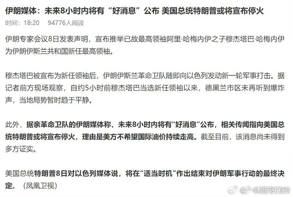 美伊开打第10天,伊朗局势突然出现转机,一是伊媒说未来8小时内将有“好消息”公布;二是特朗普或将宣布“停火”,理由是不希望国际油价持续走高。