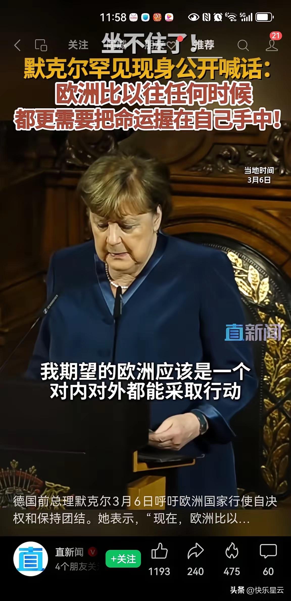 坐不住了! 默克尔罕见现身公开喊话: 欧洲比以往任何时候 都更需要把命运握在自己手中! 她呼吁欧洲国家行使自决权和保持团结。 默克尔自退出政坛后基本不再发声,这次是看到欧洲现状实在坐不住了,她肯定希望欧洲国家不跟风不分裂,在国际形势剧烈的动荡中保持欧洲国家自己的定力和自主性,行使好自决权,体现欧洲国家团结一致的凝聚力。 这次发声不是临时起意,有明确的时间与场合。当地时间3月6日晚,默克尔出现在汉堡市政厅的马蒂亚宴会上。这场宴会从1356年延续至今,今年的议题直指地缘变革下的欧盟主权,欧洲理事会主席科斯塔也到场参会。 默克尔卸任后确实低调。2021年10月离开德国总理府,她多数公开露面只用于宣传个人著作,不直接介入德欧政治讨论。2026年2月,她首次出席默茨任党主席后的基民盟党代会,全程未演讲,仅作贵宾亮相。 马蒂亚宴会上,她打破了沉默。面对四百多位政商学界来宾,她把立场说得很完整。她强调自己期待的欧洲,要能对内对外统一行动,要在世界上以一个声音说话并被认真对待。 她把议题延伸到安全之外。她认为团结的欧洲要捍卫民主、法治与人的尊严,也要守住繁荣与就业。同时,欧洲必须保护外部边界、文化认同,以及人类共同的生存环境。 俄乌冲突是她重点提及的话题。她直言2021年冲突爆发前,与普京的谈判就不该只由美国主导。她认为欧盟不能只做乌克兰的军事支持者,更要拿出外交力量推动战争结束。 这样的观点,和她执政16年的理念一脉相承。她任内推动欧盟在欧债危机中协调财政,也主导了2015年难民危机的欧洲协同应对。她始终主张欧洲要成为全球一极,而非依附于他国。 当下的欧洲,正踩在多重压力的节点。俄乌冲突进入第五年,战场陷入高消耗拉锯,欧洲的援乌疲劳感持续上升。美国第二任期奉行“美国优先”,对欧盟加征关税,还以安全保障相要挟。 美欧军事依赖也让欧洲被动。2022至2024年,欧洲北约成员国装备支出的51%流向美国军火商,远超冲突前的28%。欧盟想推进自主防务通信卫星系统IRIS2,却进展缓慢。 经济层面的挑战同样现实。联合国报告显示,2026年欧洲经济增长将保持温和,美国高关税与地缘紧张持续拖累贸易。欧盟各国还要在防务、能源转型与财政平衡之间艰难取舍。 欧洲内部的裂痕也在扩大。各国对援乌力度、能源政策、移民问题的分歧,让“统一声音”难以落地。德拉吉关于欧洲竞争力的报告提出数百条建议,一年后仅完成11.2%。 默克尔的喊话,正是对准这些困境。她不是要欧洲与美国决裂,而是要欧洲守住自身立场。她清楚欧洲的自主之路难走,却也知道再不发力,只会更被动。 她的发言在欧洲引发强烈共鸣。不少政要与民众认为,这是对欧洲战略自主的一次清醒提醒。外界也意识到,这位卸任总理的影响力,并未随时间消退。 欧洲的选择,将决定未来多年的走向。是继续在大国博弈中被动摇摆,还是真正凝聚力量,走出属于自己的道路,考验着每一个欧洲国家的智慧与决心。 各位读者你们怎么看?欢迎在评论区讨论。