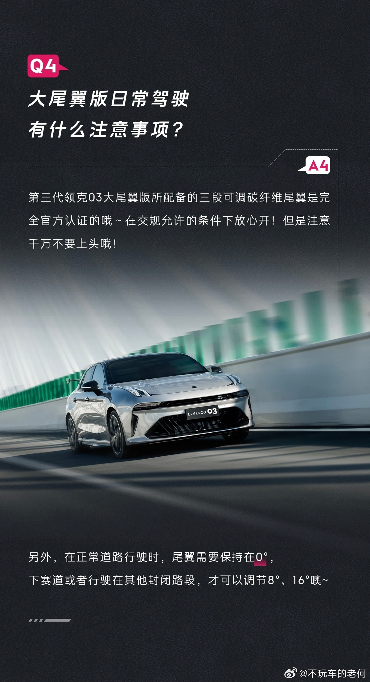 提问:第三代领克03 大尾翼版日常驾驶有什么注意事项?答:正常行驶即可,不要故意往蜀黍们经常出现的区域去行驶,不要把行驶证放在手机无线充电处等太过于容易拿取的地方,这样会显得你太刻意。