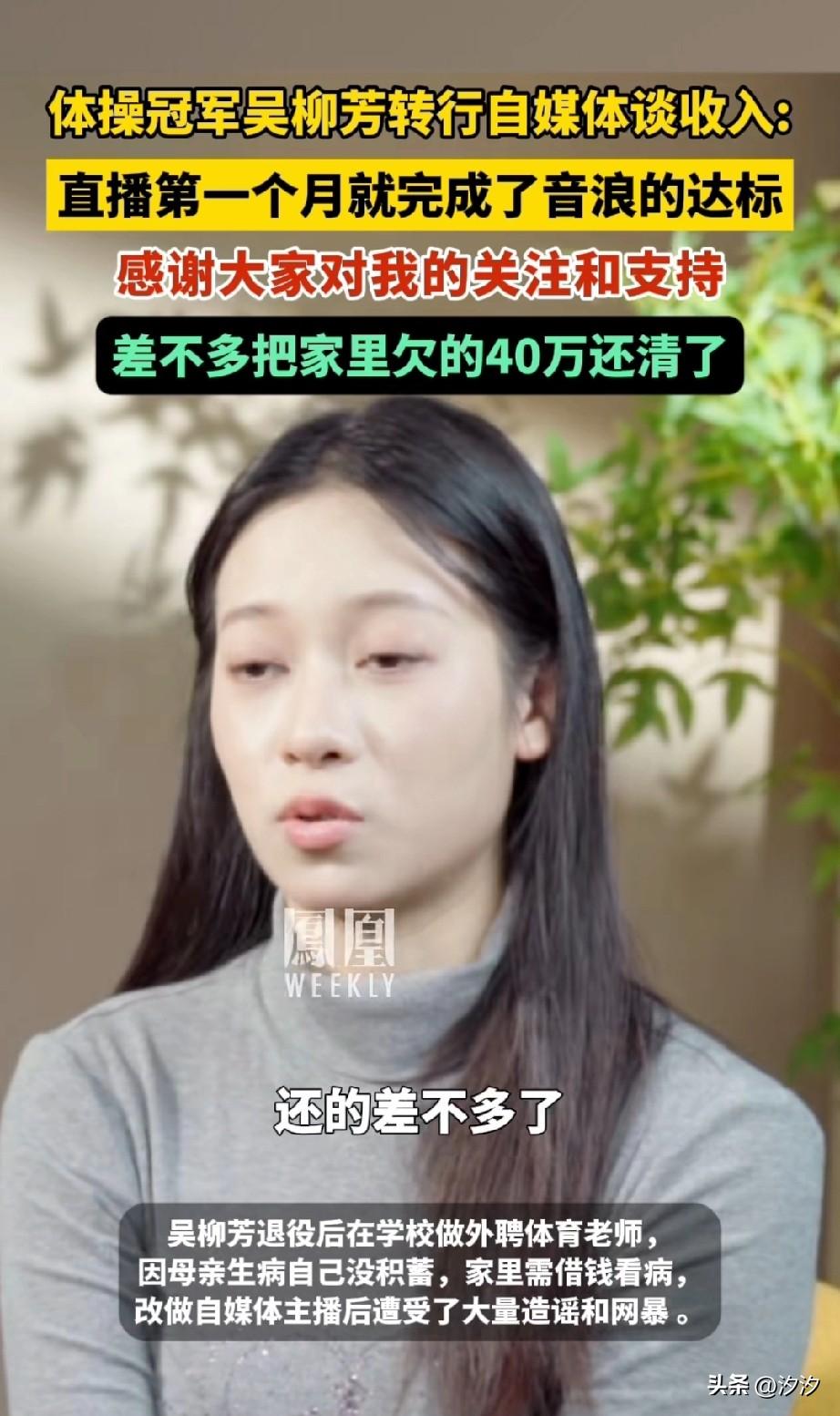 那得现在这么多人都来做主播了, 前体操冠军吴柳芳, 退役后直接做起了主播, 没想到分享了几段跳舞的视频, 粉丝直接涨到了600万, 短短一个月就挣了40万, 之前因为母亲生病, 她在学校做编外体育老师, 生活过得非常辛苦, 家里面还欠了几十万的外债, 没有储蓄的她, 为了给自己的母亲治病, 不得不开启了直播生活, 没想到吸引了很多人关注, 他也没有想到一次直播居然给她带来了新生,现在直播成为了她的主页, 一个月就还清了家里的外债, 怪不得现在很多漂亮女生都不出去打工了,都开始做起了主播, 原来主播这么挣钱, 大家觉得主播这份工作怎么样?
