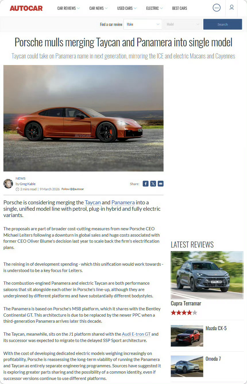保时捷或将帕拉梅拉和泰坎合并全新的MSB开发方向可能就是油电兼容,通俗点就是电改油如果是这样,不仅会有纯电保时捷Panamera,还会有纯电奥迪A8,纯电宾利欧陆GT